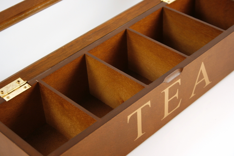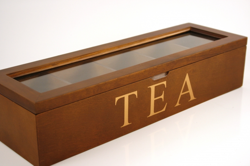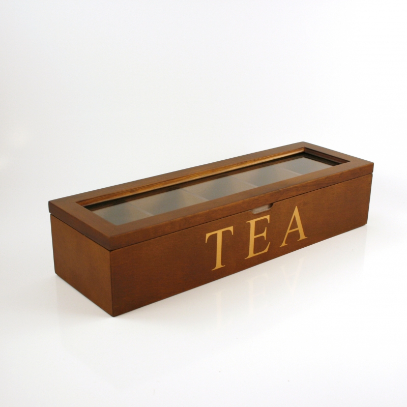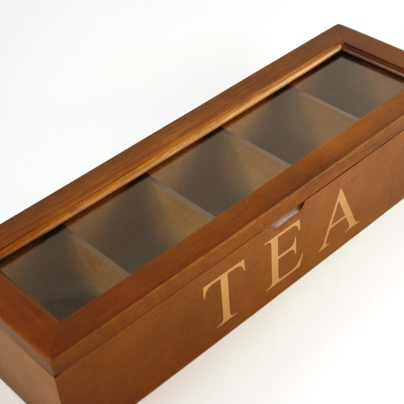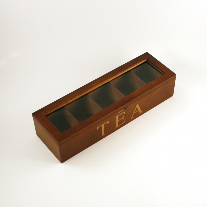 Krabička na čaj má vnútorný priestor rozdelený do piatich rovnakých priehradiek . Tie sú umiestnené v jednej rade vedľa seba .