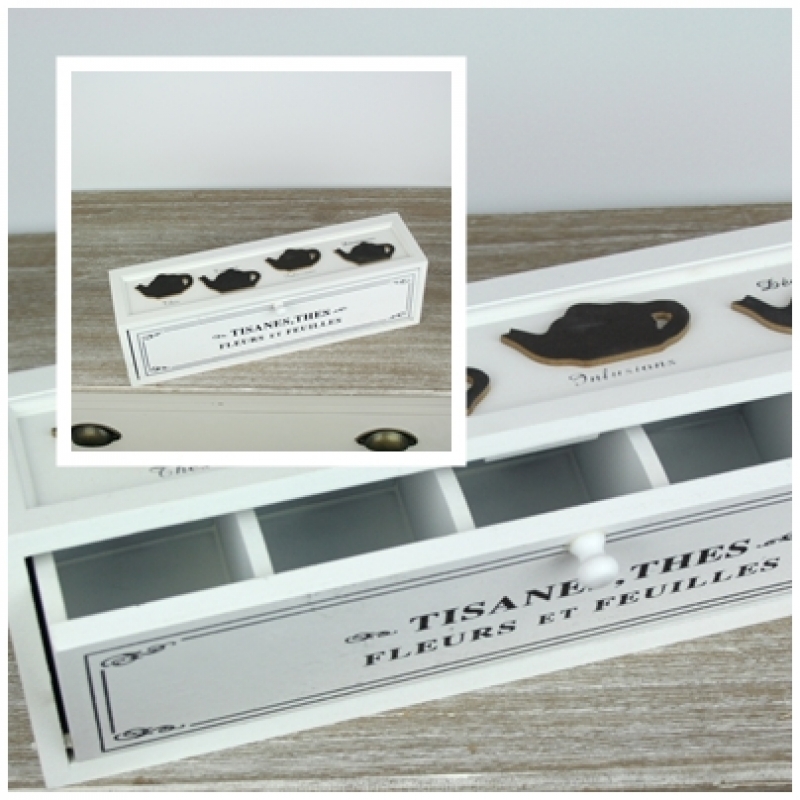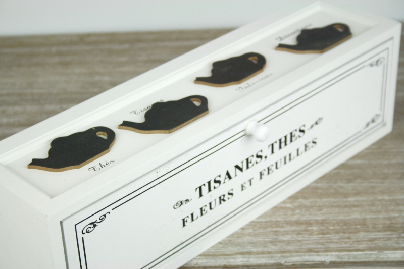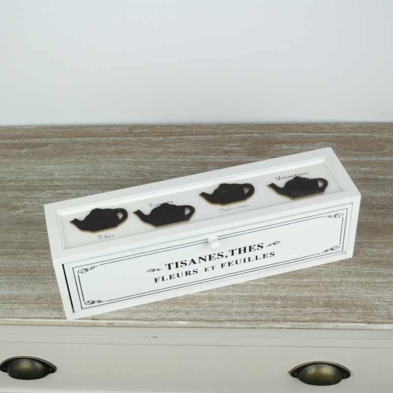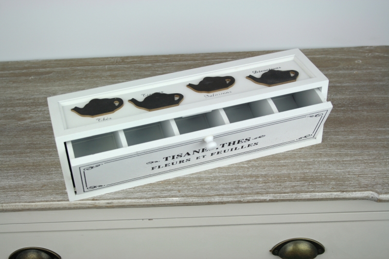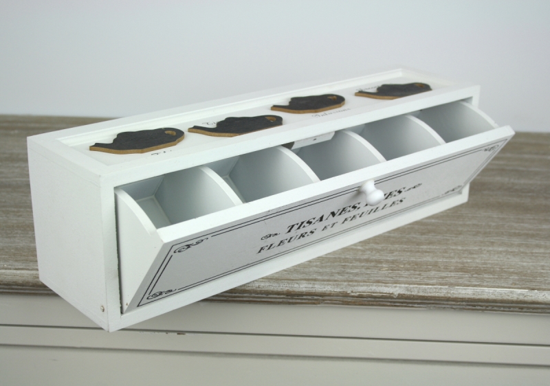 Krabička na čaj 9x33x9,5 cm v bielej farbe a motívom konvičiek má originálny otváranie. Nemá klasické veko, ale predná strana je výklopná. Krabička má celkom päť priehradiek na sáčkové čaju. Môžete tak mať prehľad v príchutiach, ktoré máte najradšej.