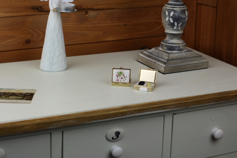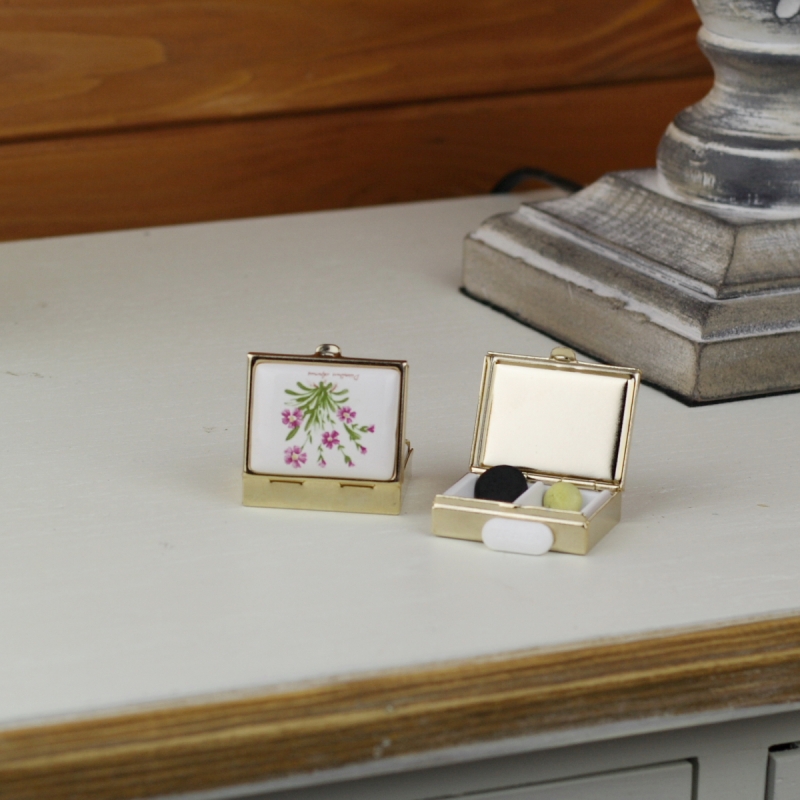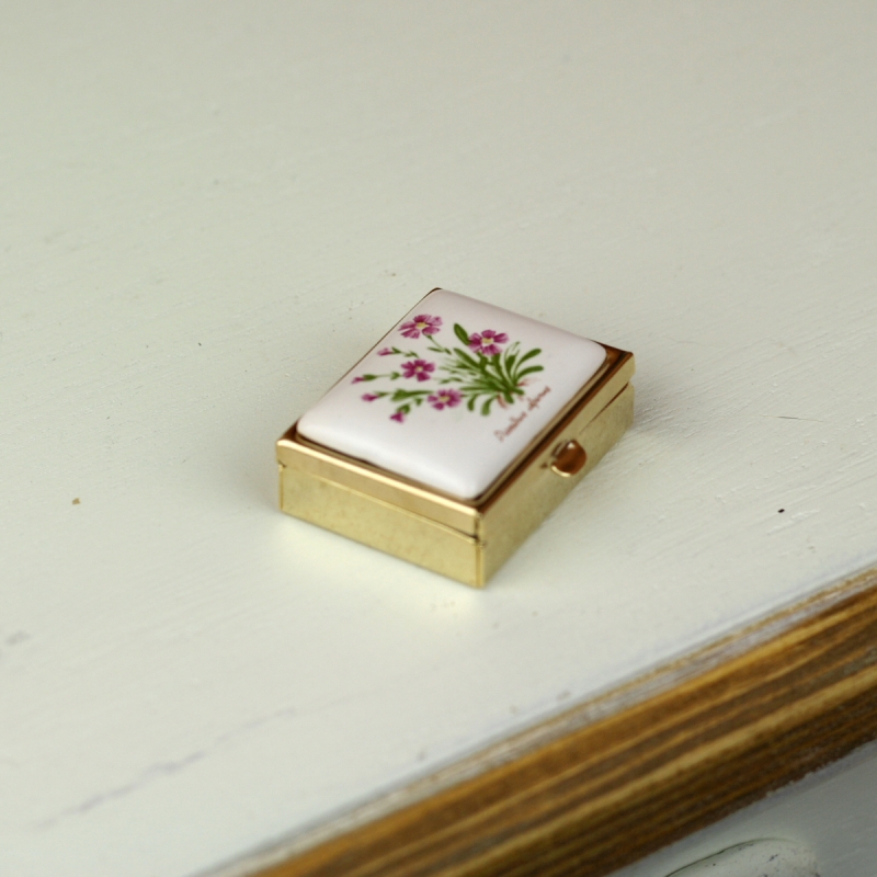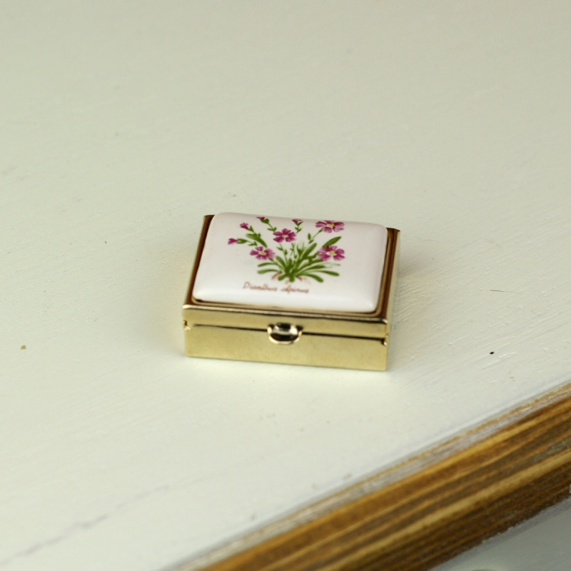 Kovový krabička má plastovú vsadku s dvoma okienkami. Horná strana je zdobená motívom bylinky s ružovými kvietkami.
