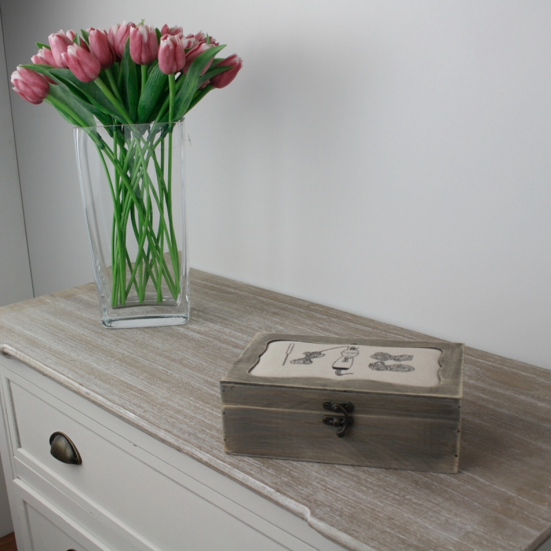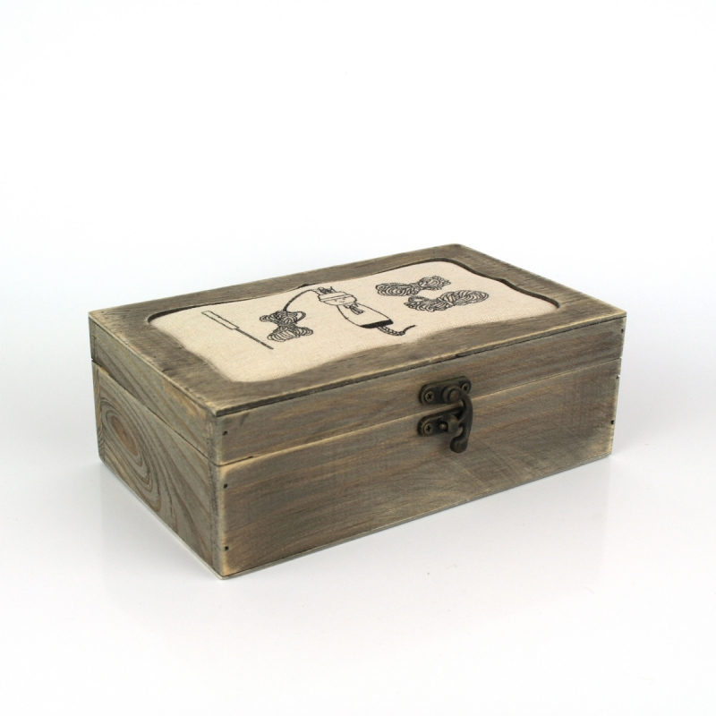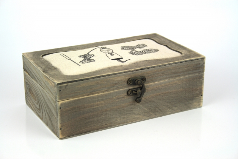 Krabička je nielen praktická, tiež krásne vyzerá. Veko je ozdobené textíliou s motívom klbiek. Veko môže slúžiť aj ako ihelníček. Krabička nie je vo vnútri nijako delená.