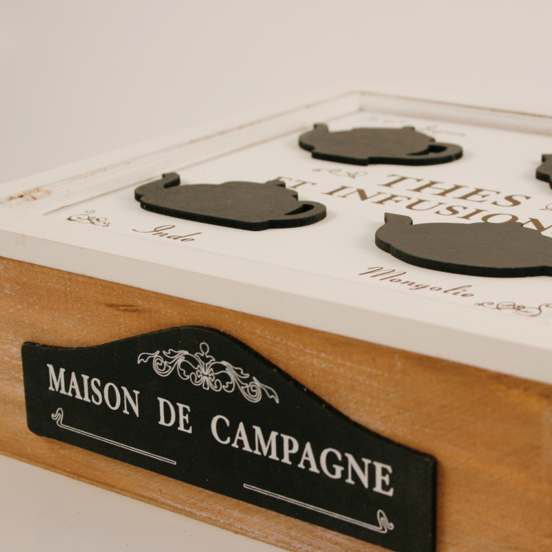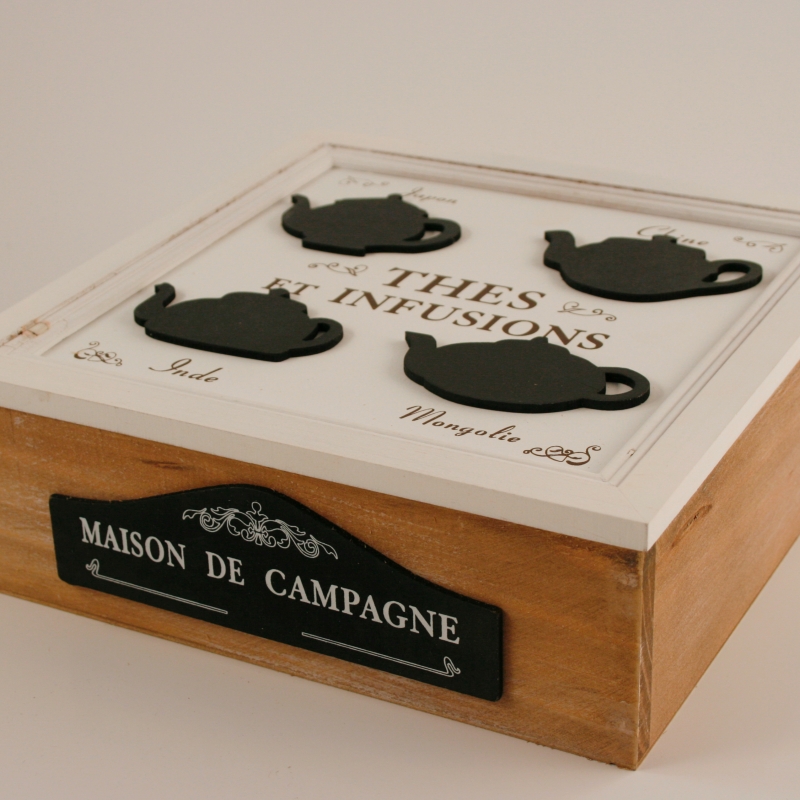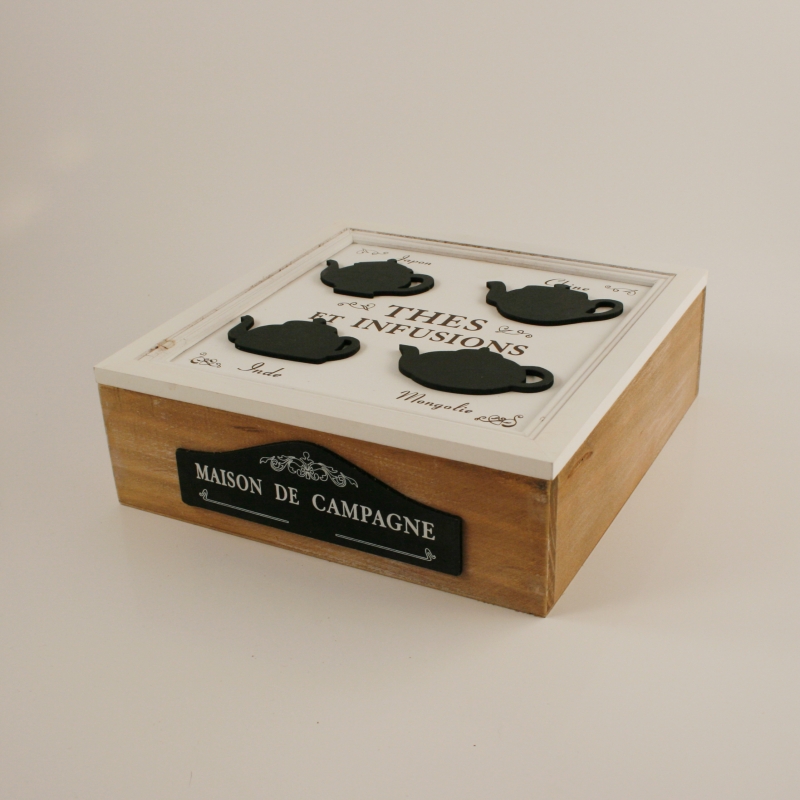 Krabička s motívom konvičiek je drevená a má rozmer 24 x 24 x 8 cm . Ako napovedá jej zdobenie - kanvičky , je určená predovšetkým na uchovávanie voňavých vrecúšok čaju . Samozrejme je však na každom majiteľovi , ako túto drevenú krabičku využije .