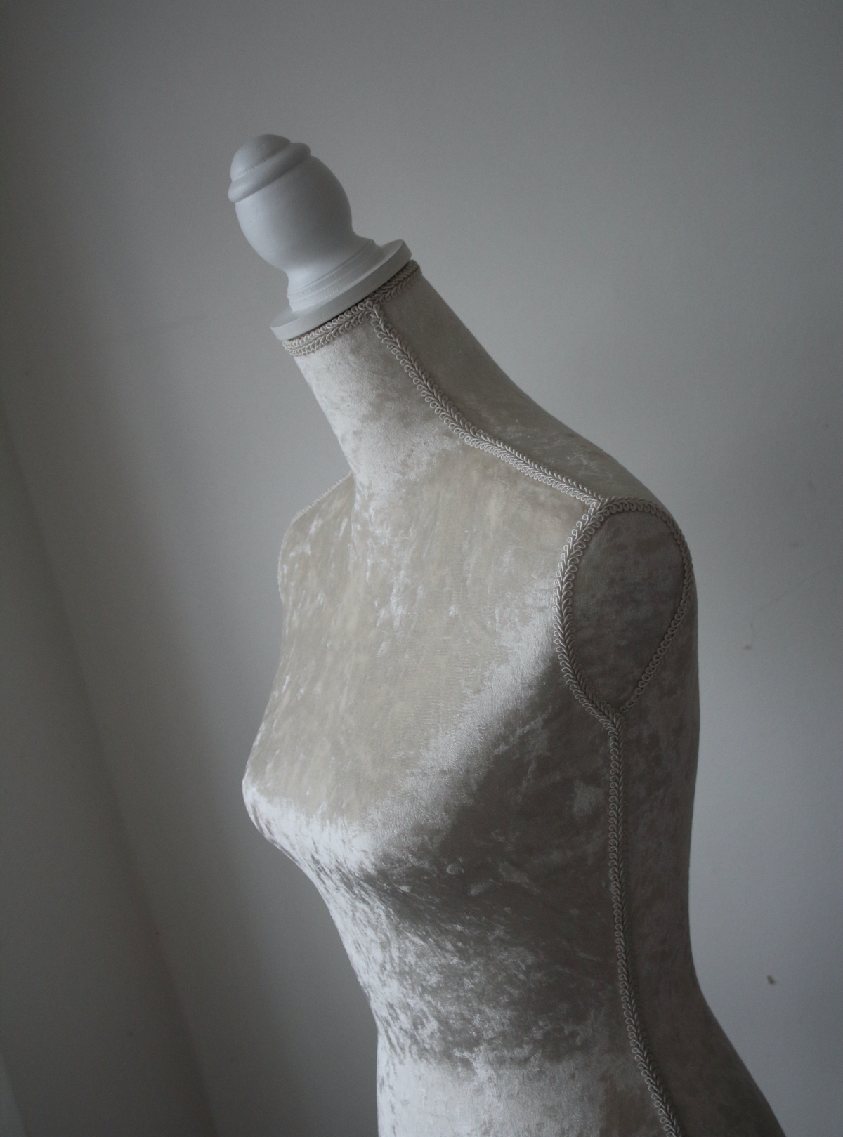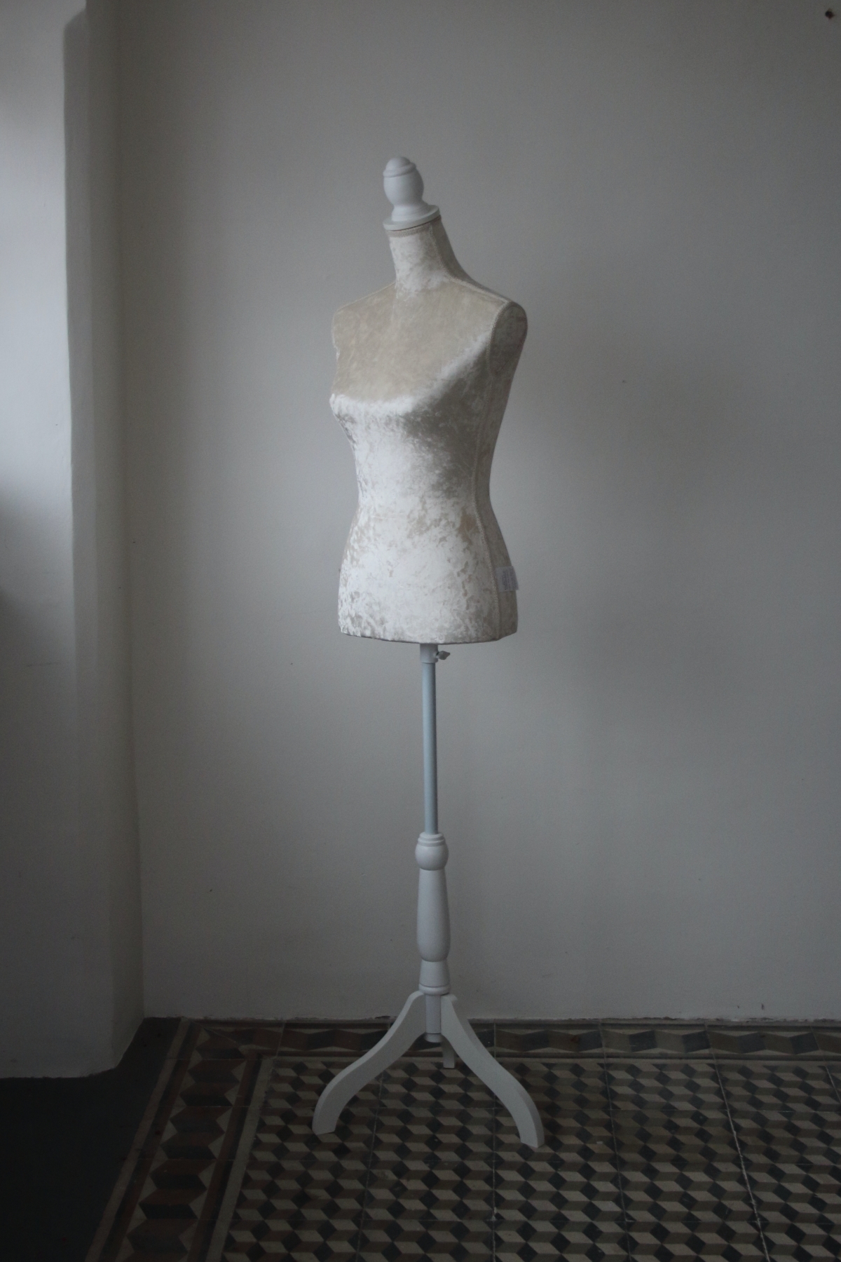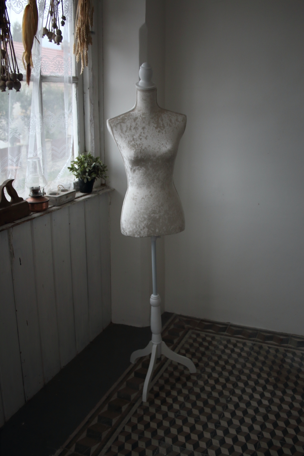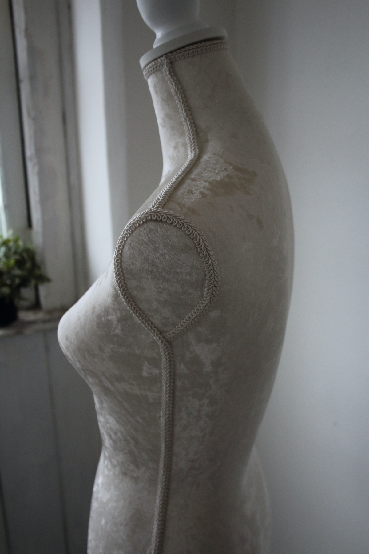 Čistotu a luxus, tejto krajčírske panne,  prepožičiavajú použité materiály a prvky. Matne lesklý zamat, v smotanovej farbe, je doplnený bielo natretým, dreveným sústruženým stojanom a záslepkou krku. Čerešničkou na torte je detail v podobe ozdobného bieleho prámika, ktorý prekrýva švy.