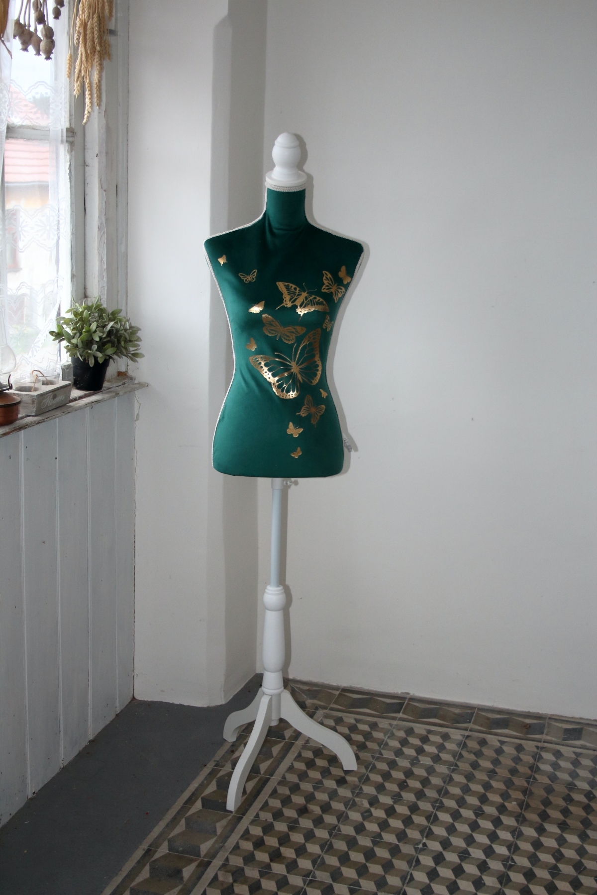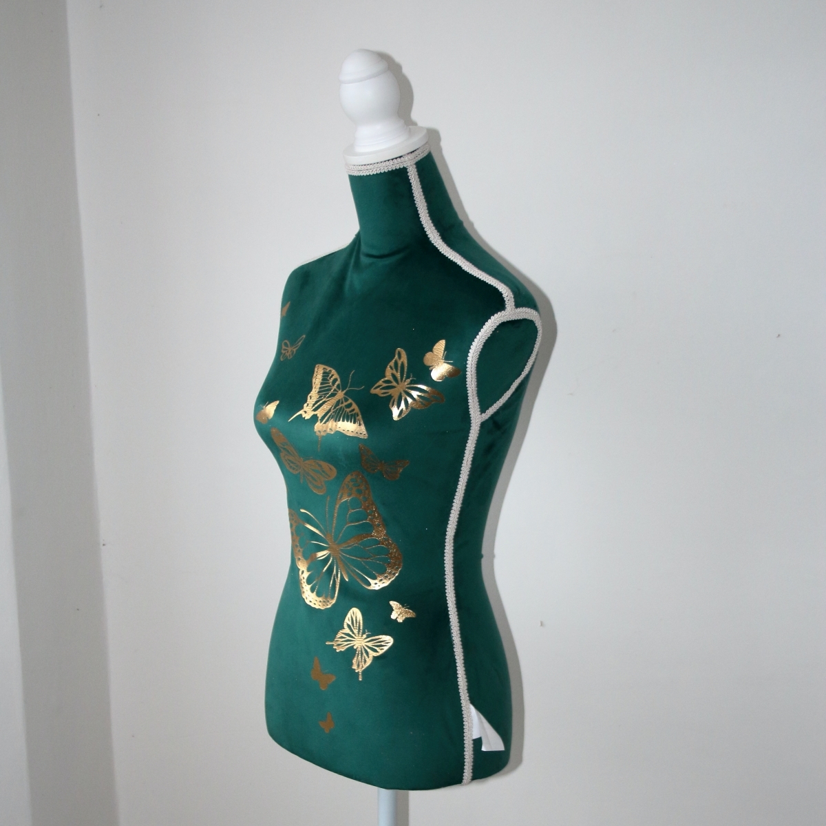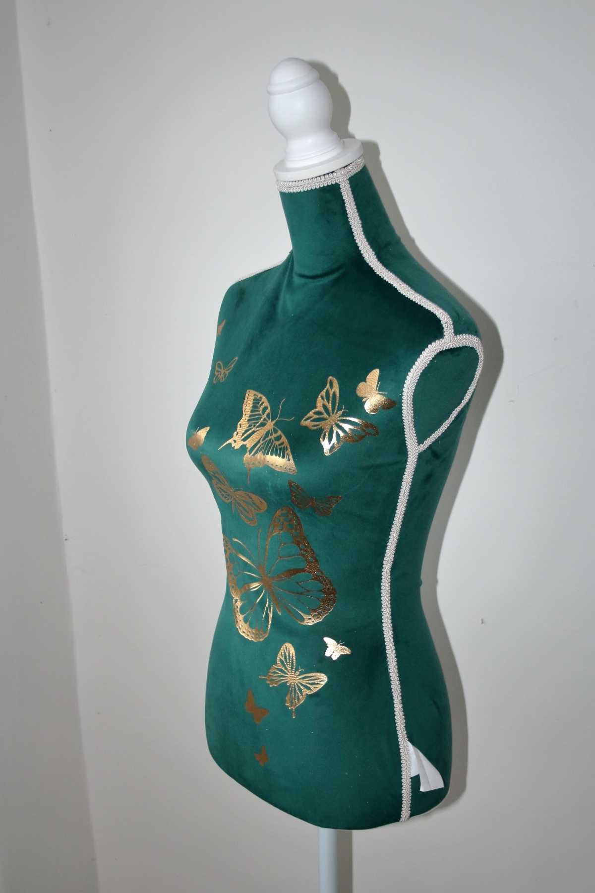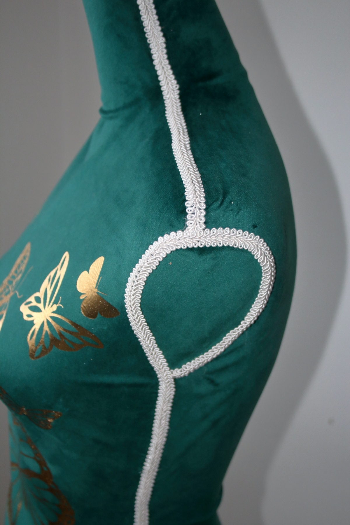 Krajčírska panna je potiahnutá, matne lesknúcim sa, smaragdovým zamatom, ktorý je na jej prednej časti zlate potlačený. Potlač tvorí niekoľko motýlikov, rôznych druhov a veľkostí. Spoločne s drevenými sústruženým a bielo natretými prvky stojana a záslepky krku, tvoria štýlový celok, ktorý je ešte korunovaný ozdobným bielym prámikom, ktorý zakrýva všetky viditeľné švy.