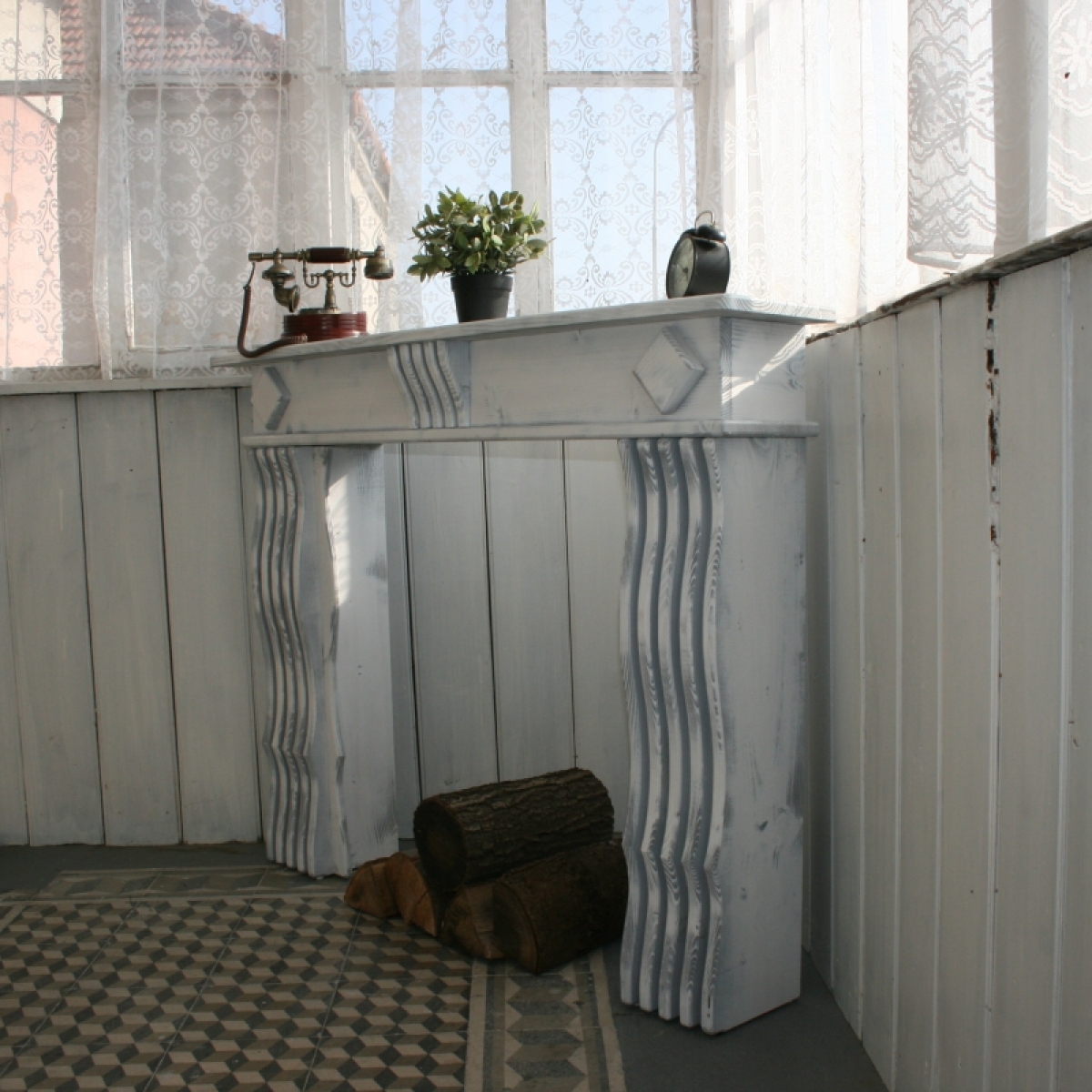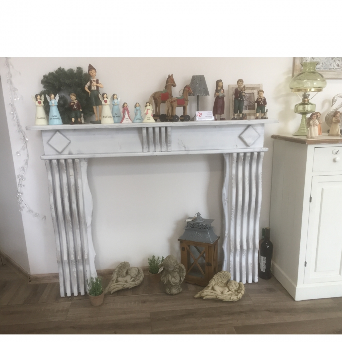Falošná krbová rímsa bude krásnou dekoráciou. Môžete ju doplniť o elektrický krb alebo do voľného priestoru vyskladať klátiky dreva, ktoré ku krbu jednoducho patria.