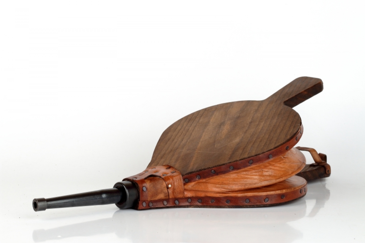 Funkčná krbovej dúchadlo je vyrobené z dreva, zdobené vypaľovaním, cvočky a doplnky z pravej kože.