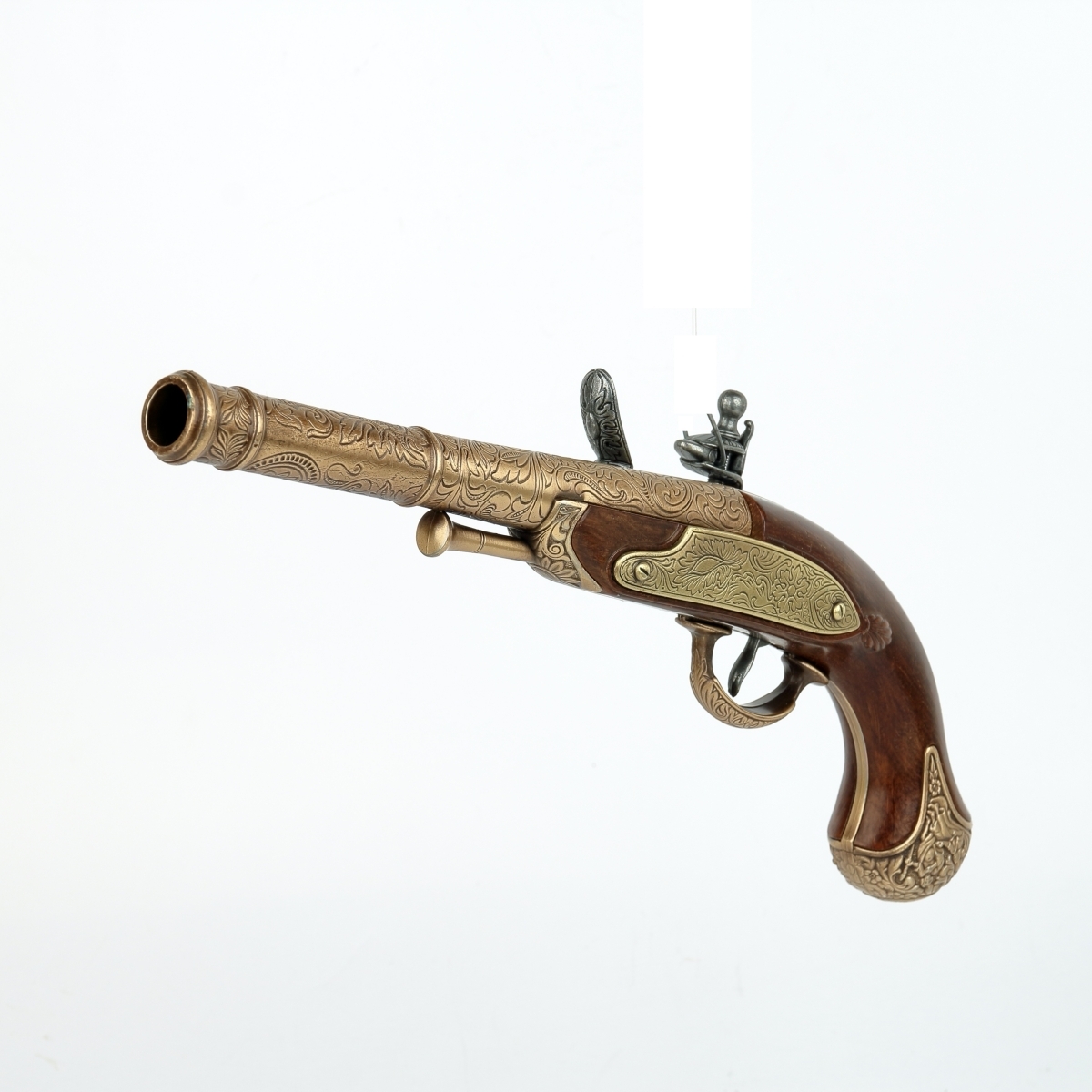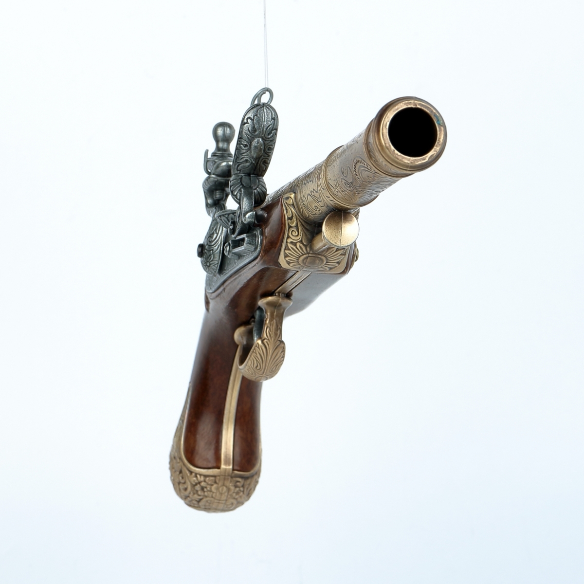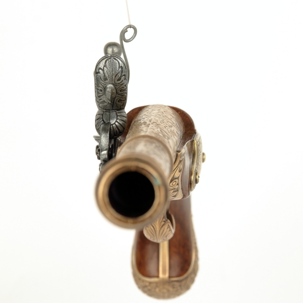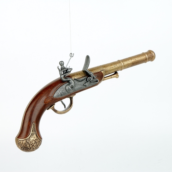 luxusně provedená nefunkční replika historické křesadlové pistole z dokonalé imitace dřeva a kovu barvy bronzu
