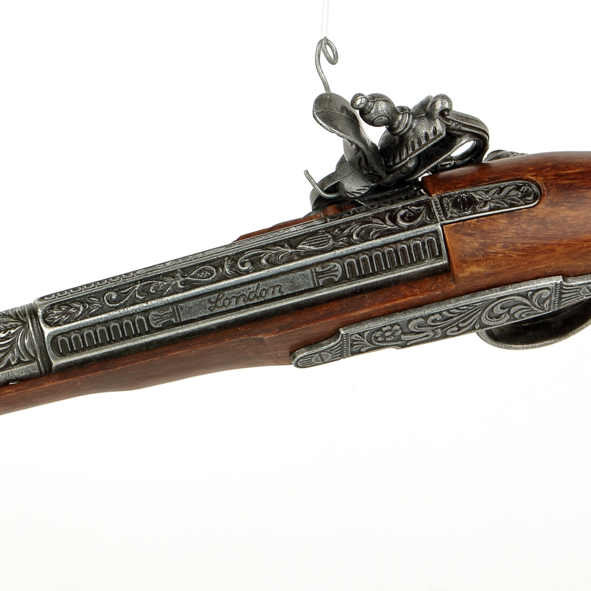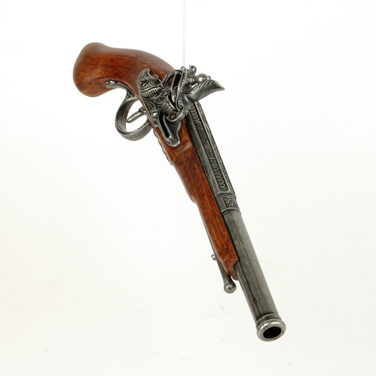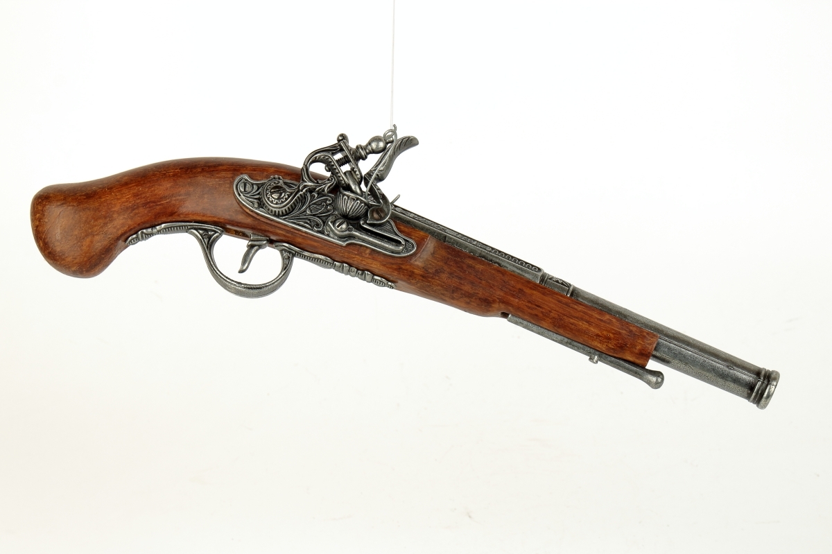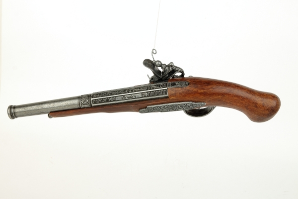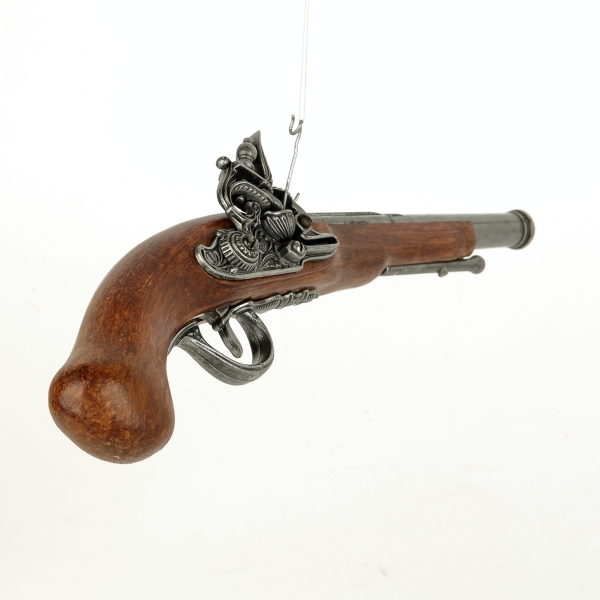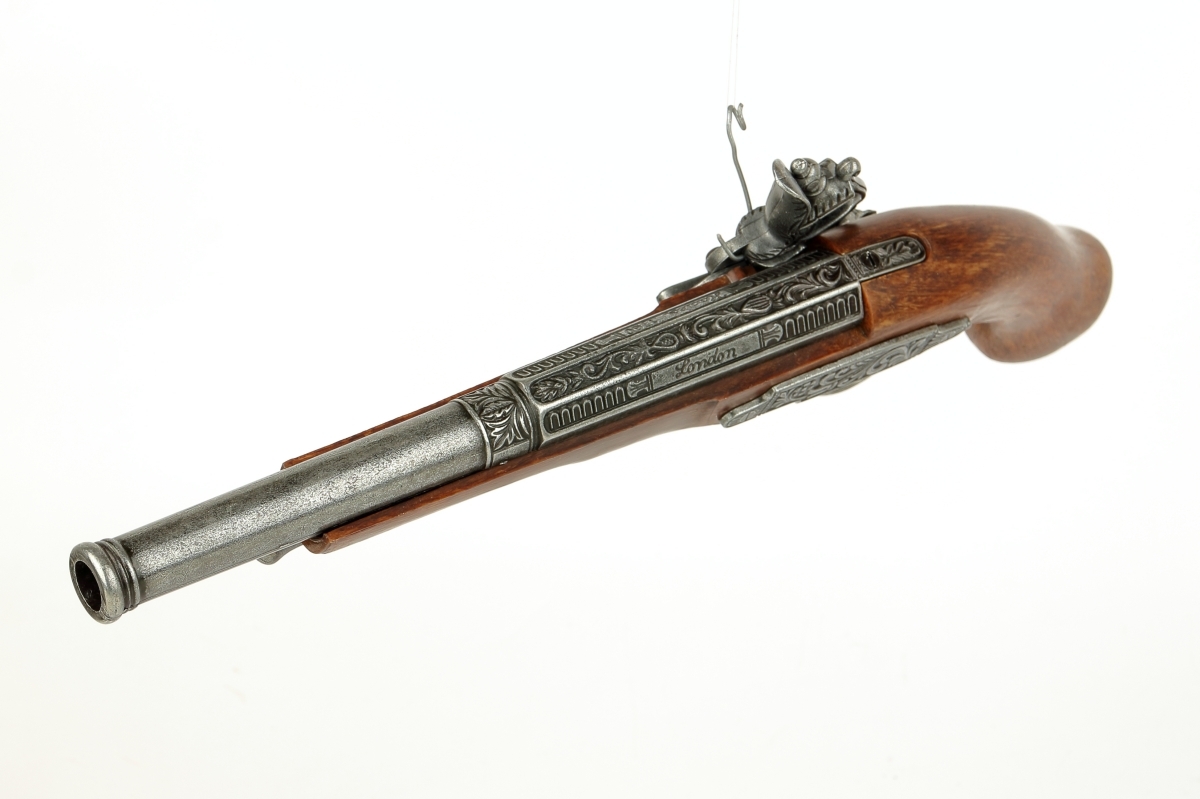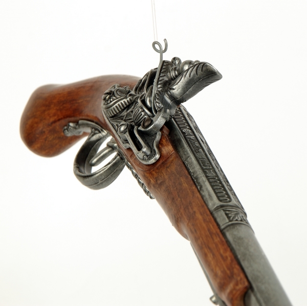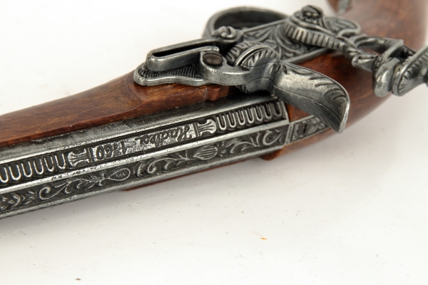 luxusně provedená nefunkční replika historické křesadlové pistole z dokonalé imitace dřeva a šedého kovu
