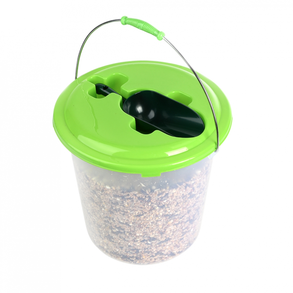Kŕmenie pre vonkajšie vtáky vo vedierku s lopatkou.