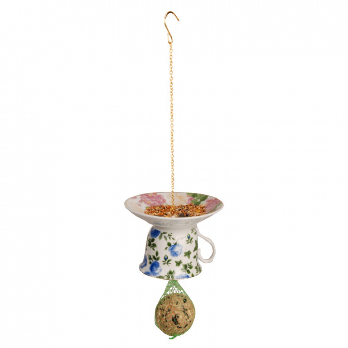Kŕmidlo na lojové gule v podobe štýlového šálka s tanierikom s kvetinovým motívom v modrej farbe
