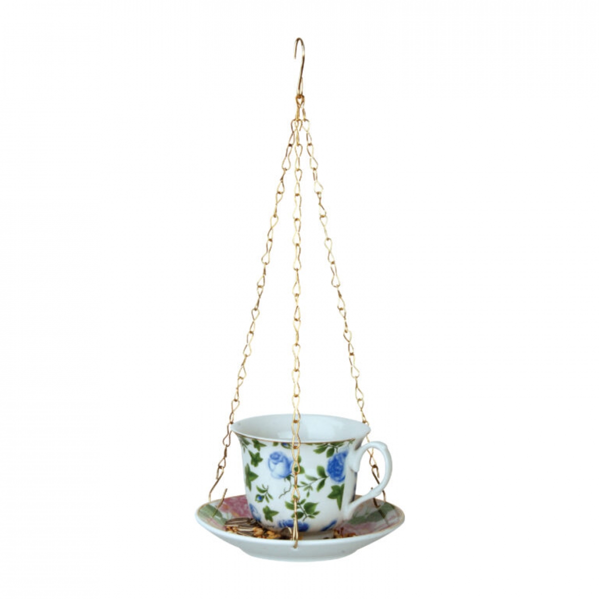 Kŕmidlo na zavesenie ako šálka s kvetinovým motívom v modrej farbe