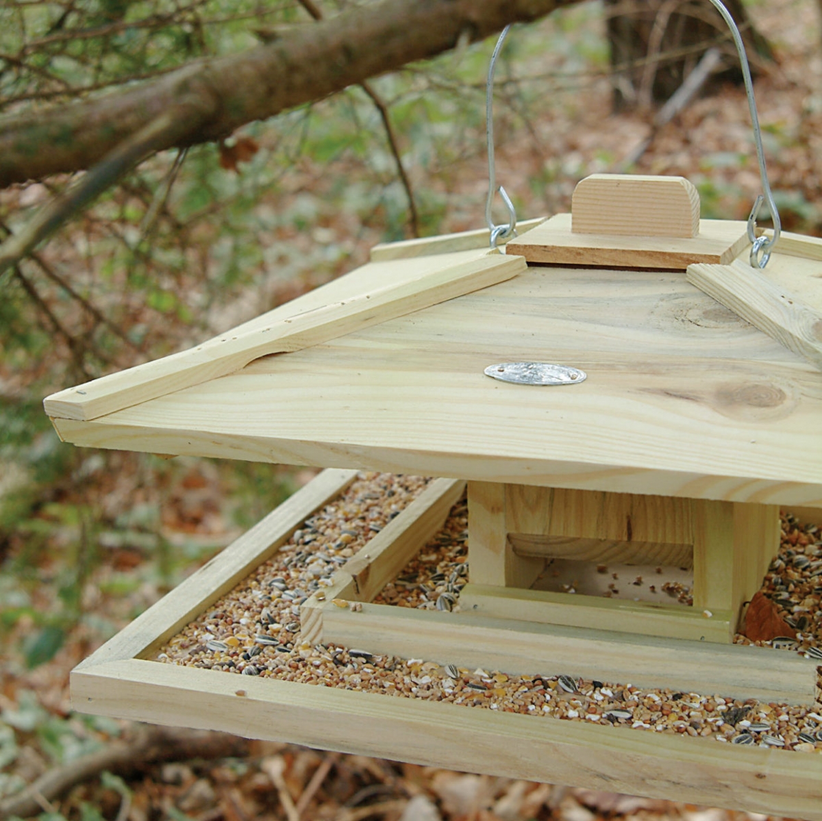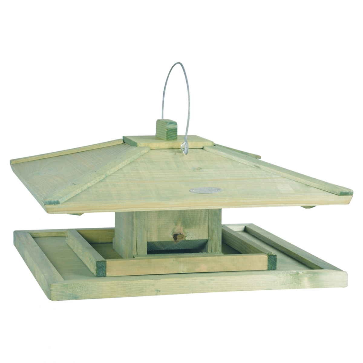 Kŕmidlo pre vtáky je vyrobené s kovovým drôtikom pre zavesenie, s nízkou strieškou.
