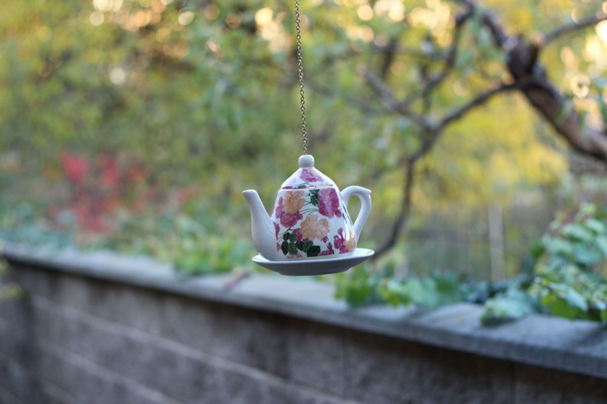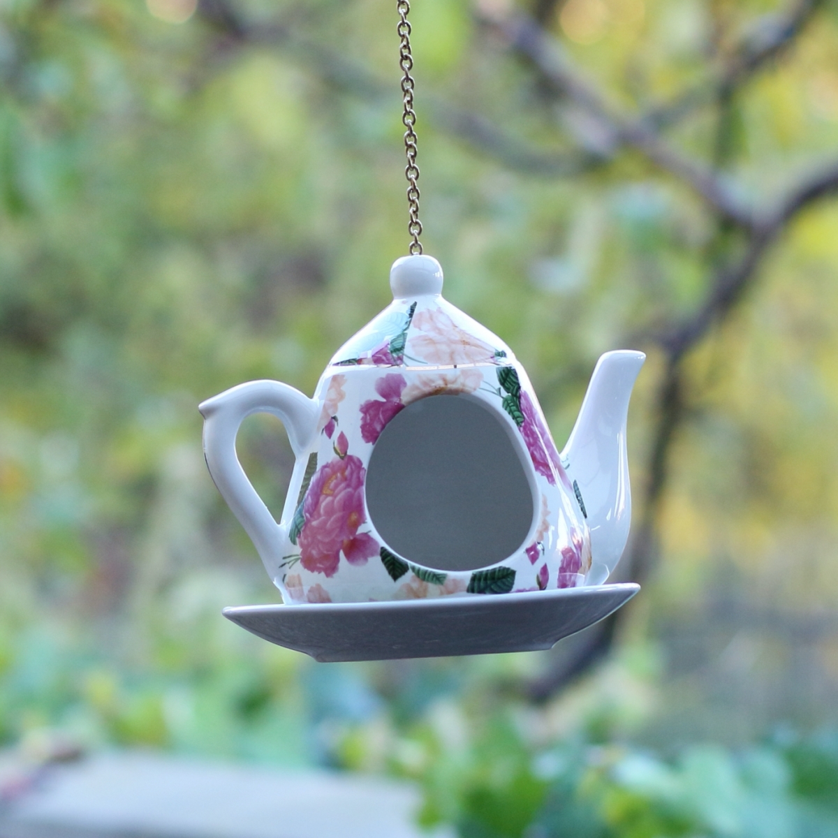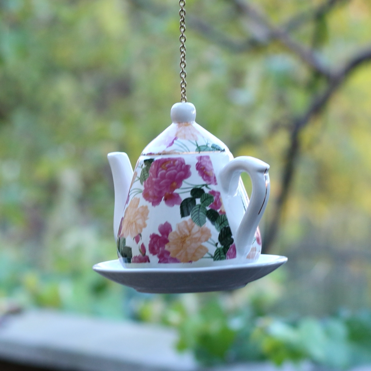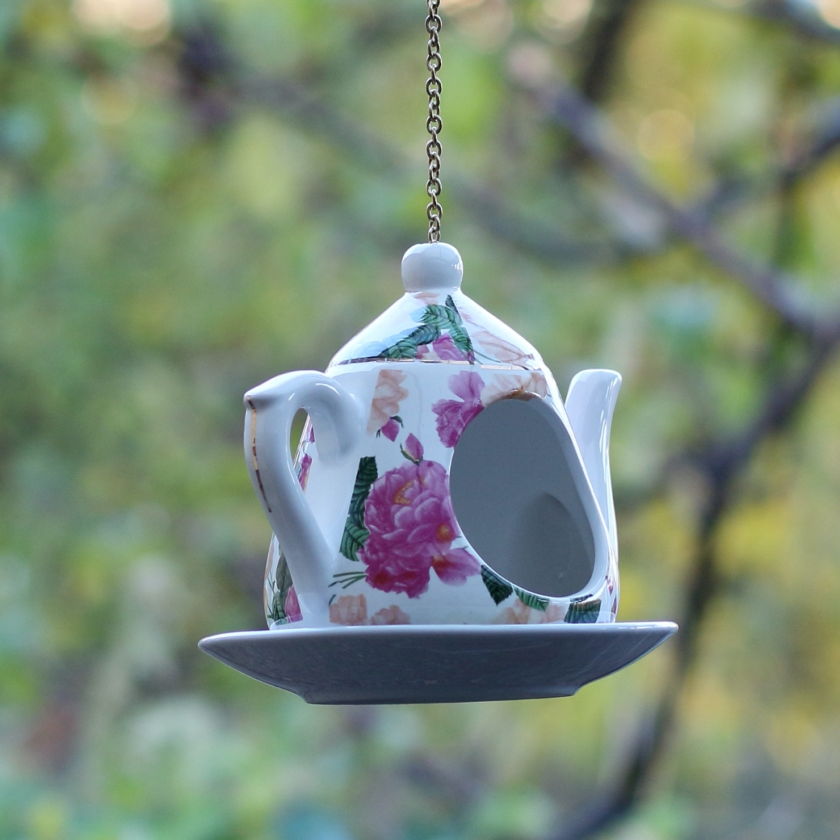 Kŕmidlo pre vtáky na zavesenie v podobe kanvičky s kvetinovým motívom v krémovo-ružovej farbe