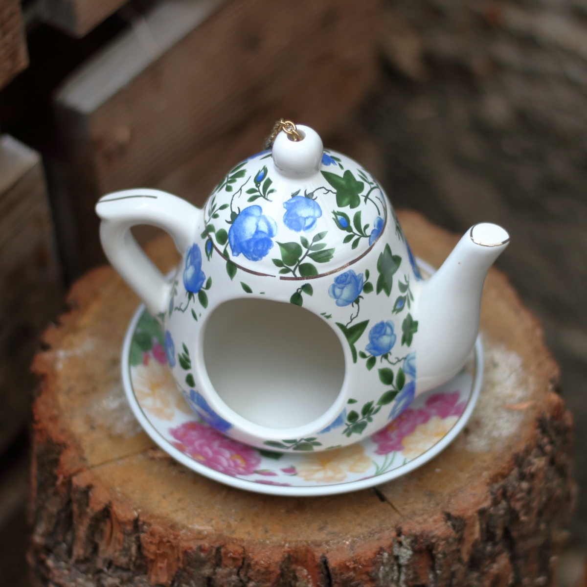 Kŕmidlo pre vtáky v podobe kanvičky s kvetinovým motívom v modrej farbe