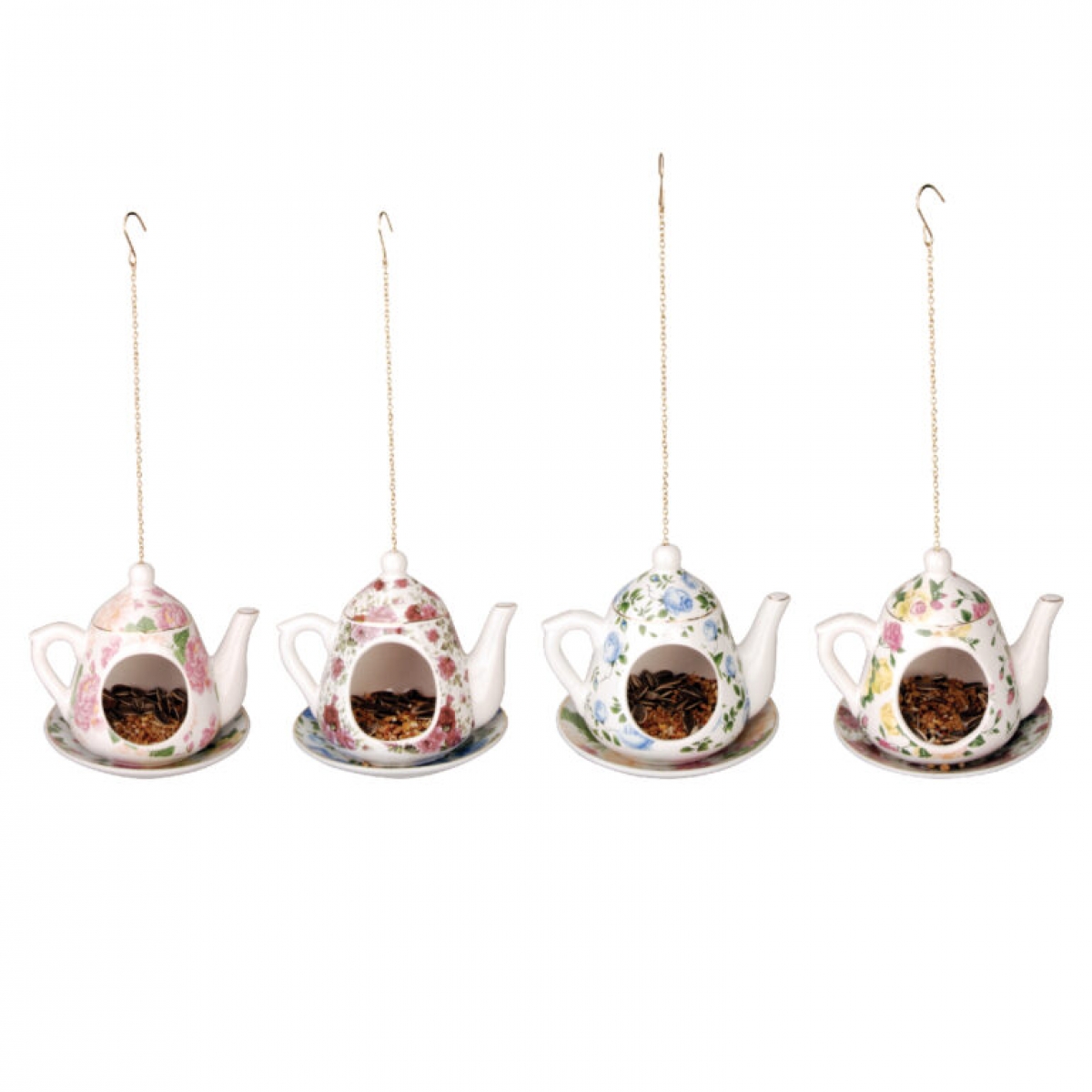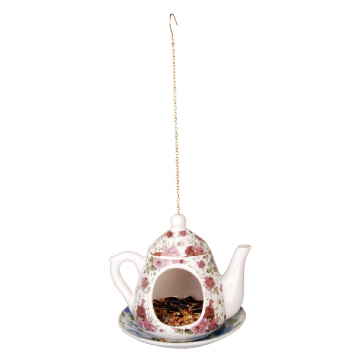 Kŕmidlo pre vtáky v podobe kanvičky na retiazkový závese s kvetinovým motívom v ružovej farbe