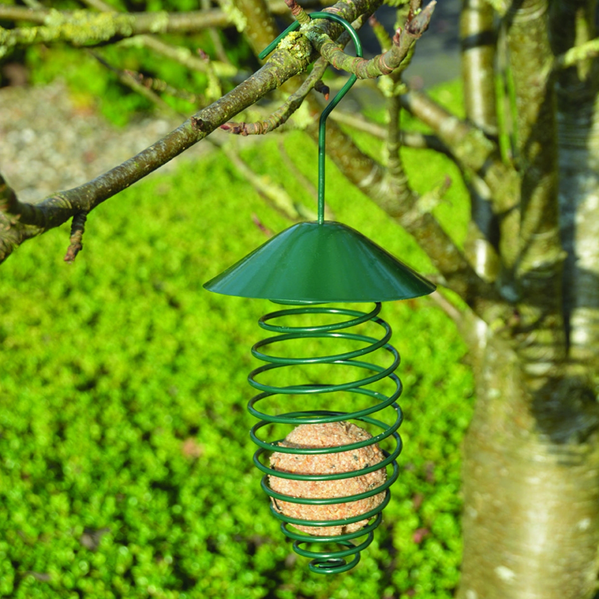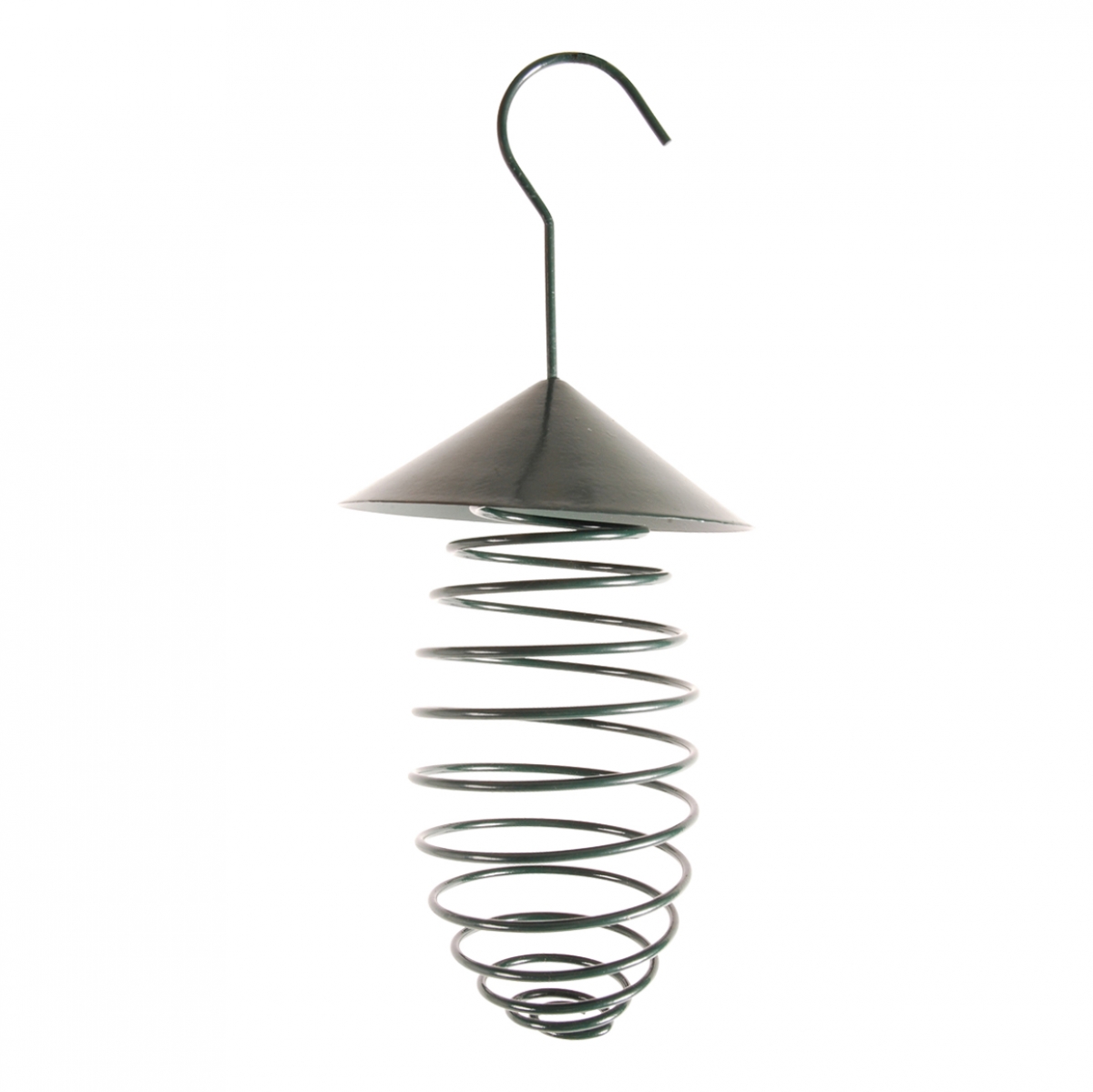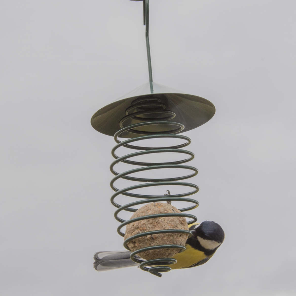 Kŕmidlo pre vtáky na lojové gule so strieškou a plniaci pružinou.