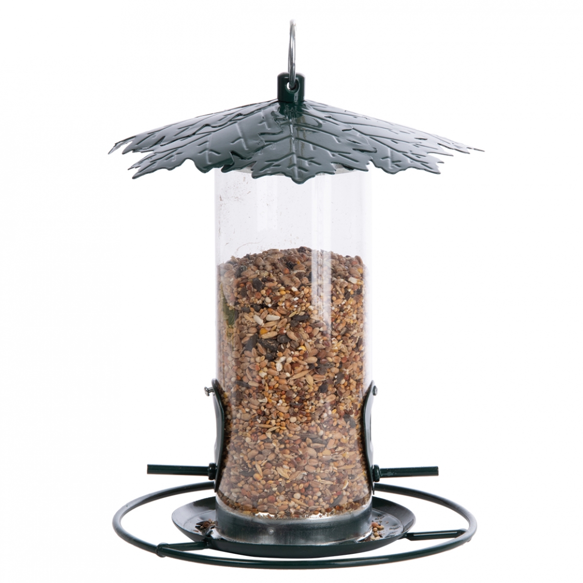 Toto kŕmidlo pre vtáky so zásobníkom s listovou strechou chráni vtáčie krmivo pred poveternostnými vplyvmi.