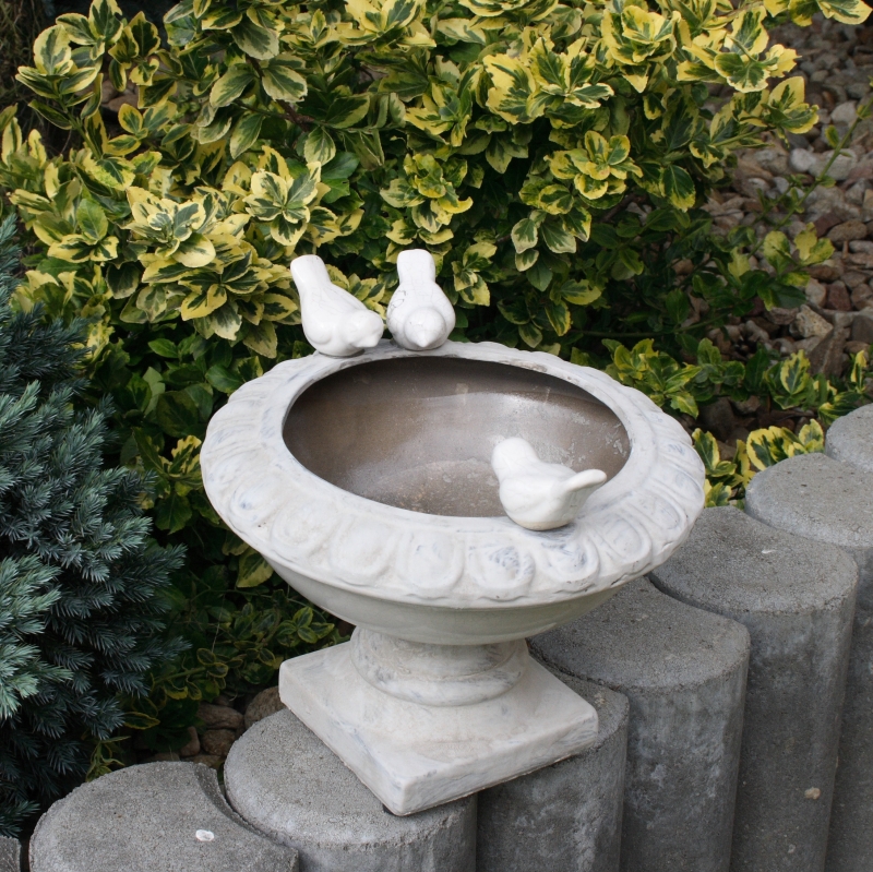 Úžasná keramická misa na podstavci, ktorá má na svojom okraji pripevnené tri vtáčiky. Misa je navrhnutá ako napájadlo pre vtáky, ale nič Vám nebráni použiť ju ako netradičný kvetináč.