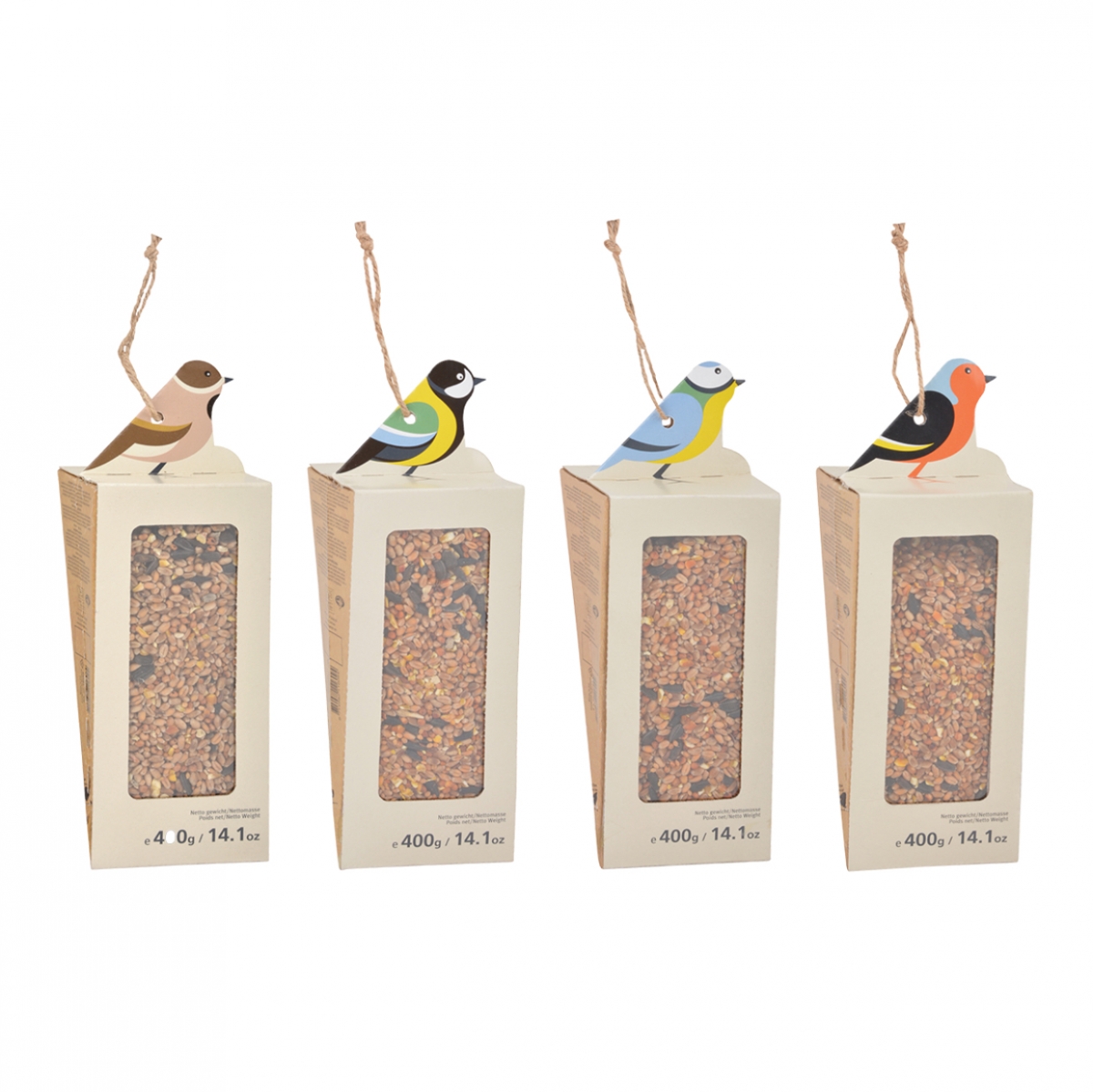 V našej ponuke nájdete rôzne varianty tohto lepenkového krmítka pre vtáky, líšiace sa vyobrazeným vtáčikom a obsahom.