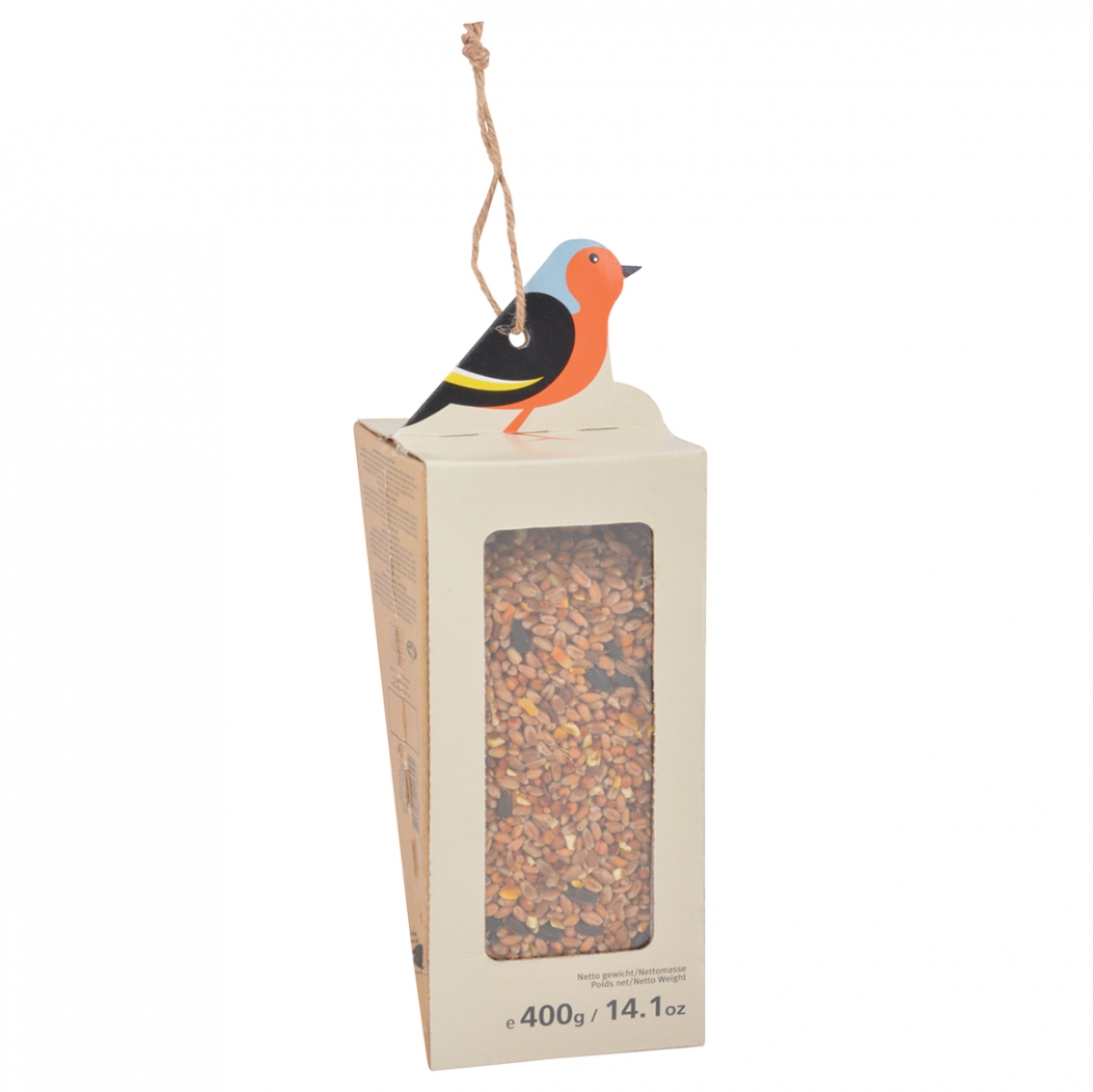 Materiál: lepenka, PP, juta, čierna slnečnicové semená, proso žlté, pruhované slnečnicové semená, nasekané arašidy, slnečnica lúpaná, červené proso, čierna repka, sekané kukurica, pšenica