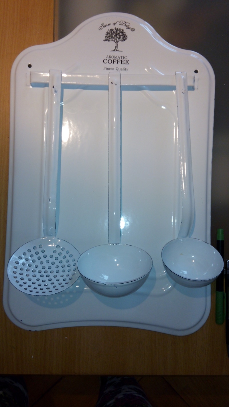 Kuchyňské náčiní z bílého smaltu, set 3 kusů. Tato sada 2 naběraček a jednoho minicedníku na smaltovaném podkladě vám určitě udělá na chalupě nejen radost, ale i pomůže při vaření.
