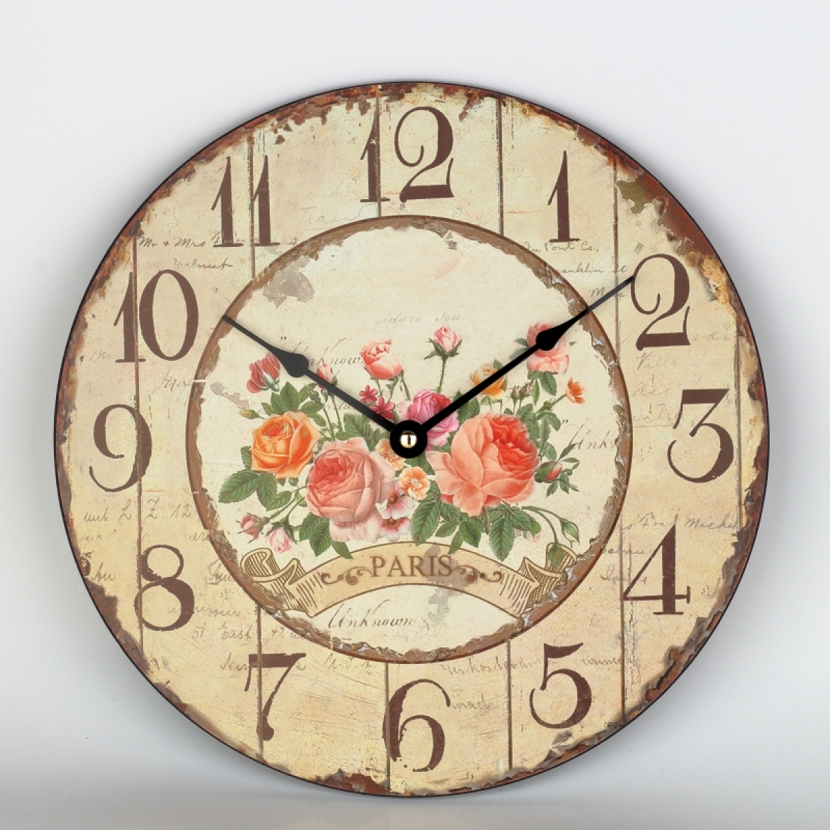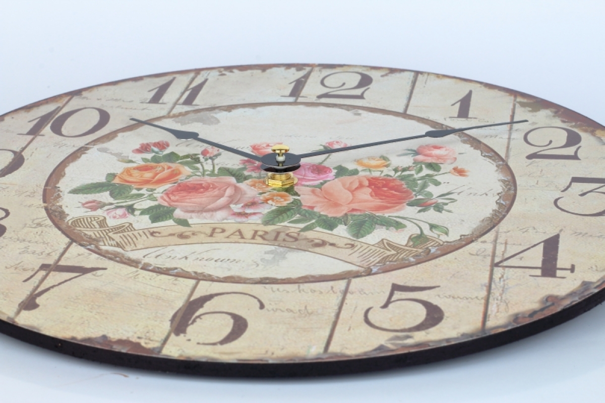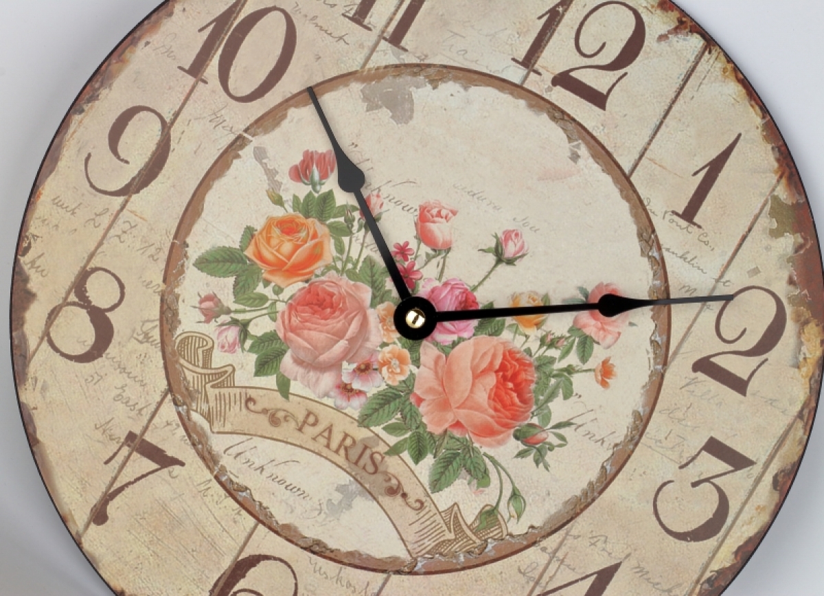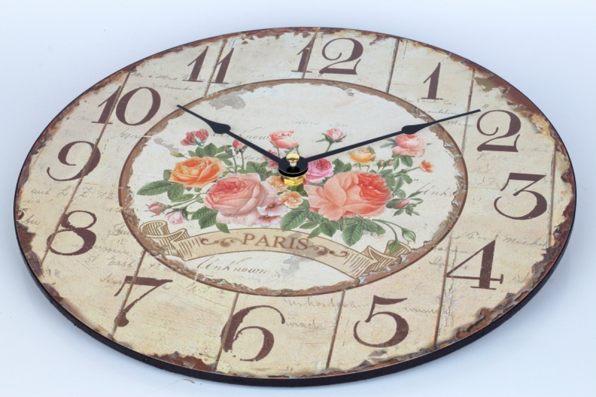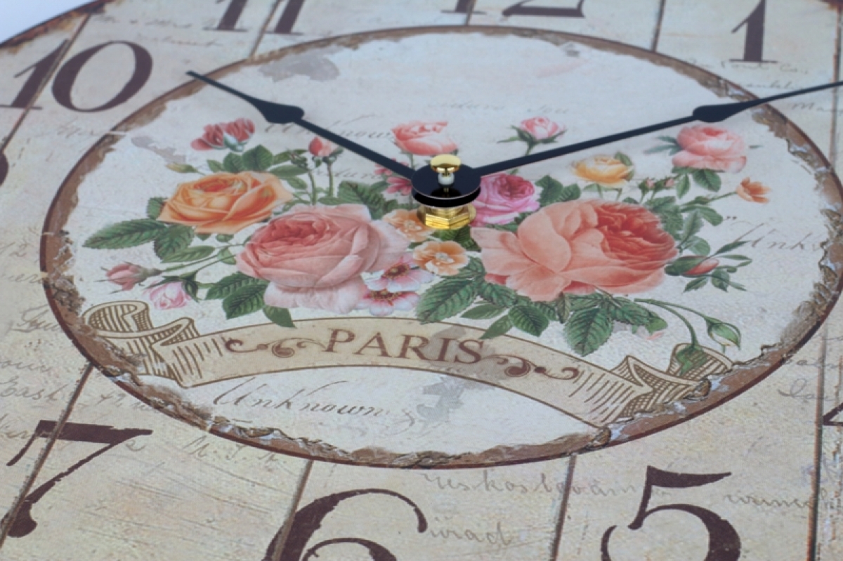 Kuchynské nástenné hodiny s ružami Paris 30cm Vám vždy prezradí presný čas a kuchyni pristanú! Starobylý vzhľad v kombinácii s motívom kvetín je jemný, elegantný a do vidiecky ladeného interiéru sa skvele hodí.