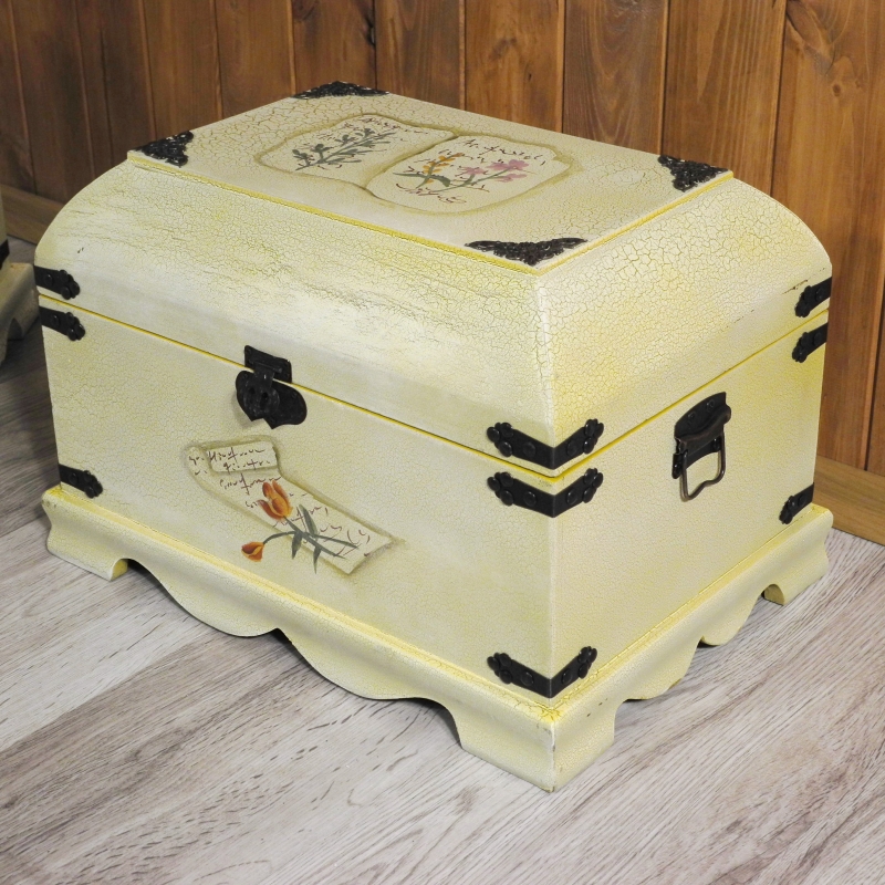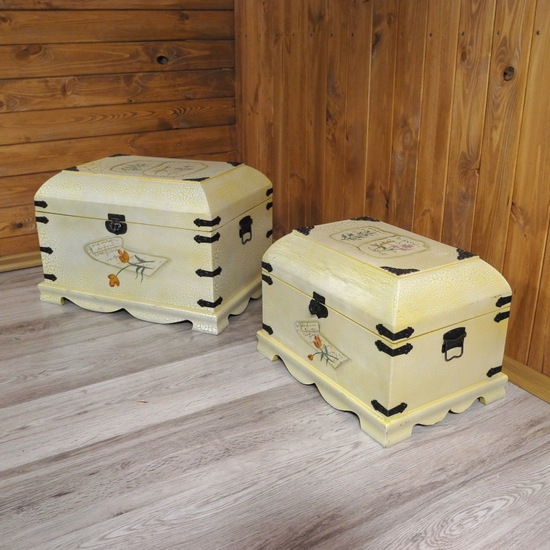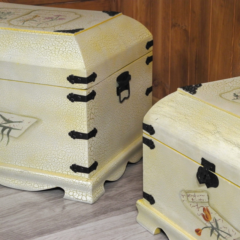 Kufr pripomína truhlu. Dodávame je v sade. Väčší truhla má rozmer 51 x 36 cm a výšku 37 cm. Otvorená dosiahne výšku 58 cm. Menšie truhla má rozmer 41 x 29 cm a výšku 29 cm, ktorá sa pri otvorení zväčší na 47 cm. Obe truhly v bielej farbe zdobí kvetinový dekor na veku i po stranách. Výrobok svojím lakovaním i celkovým vzhľadom nádherne zapadá do veľmi obľúbené kolekcie vintage štýlu. Dýcha na nás starými, dobrými, pokojnými časy. Kvalitné truhly sú vyrobené z dreva s kovovými doplnkami.