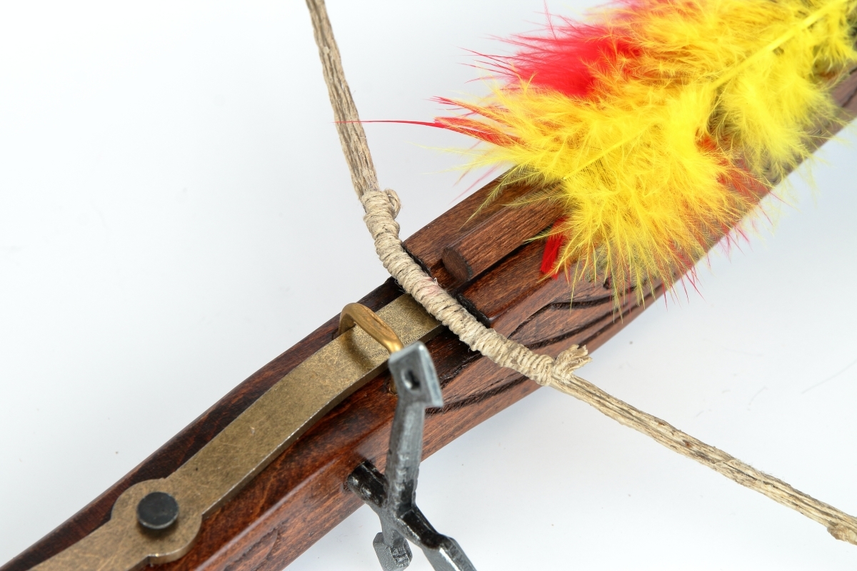 Nefunkčná replika historickej primitívnej kuše s horným spúšťacím mechanismom vyrobená z dreva a šedého a bronzového kovu s drevenou šípkou. Pre tento svoj jednoduchý mechanizmus, je často nazývaná promitívne kuše.