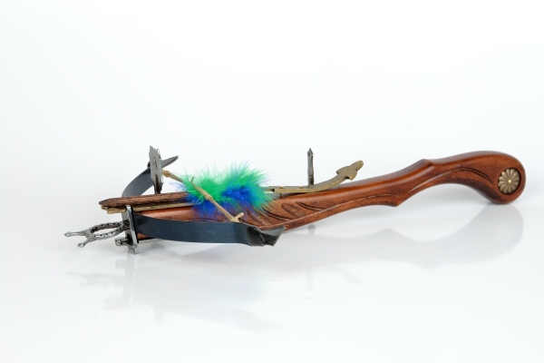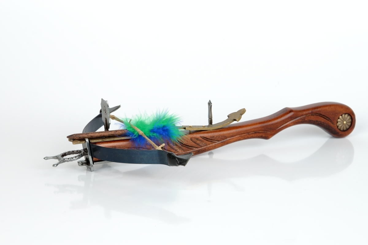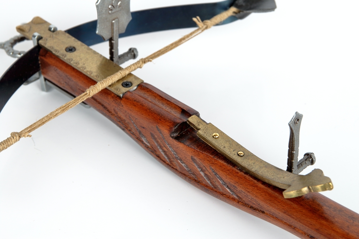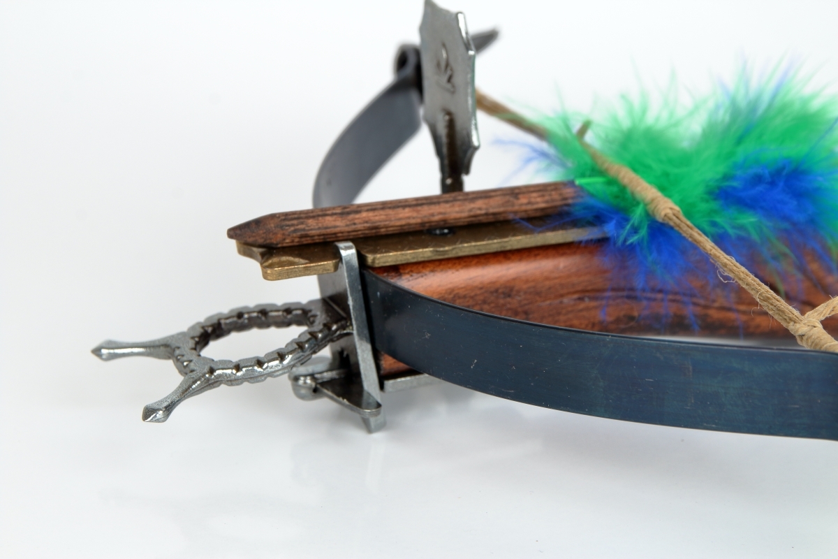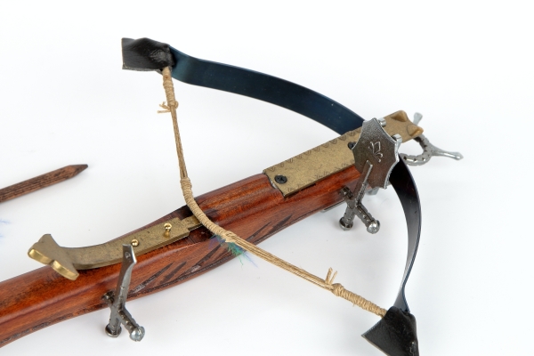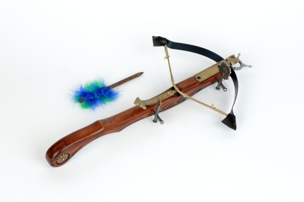 Malá nefunkčná replika historickej kuše s vrchnou spúšťou vyrobená z dreva a šedého kovu s drevenou šípkou a mosadzným zdobením