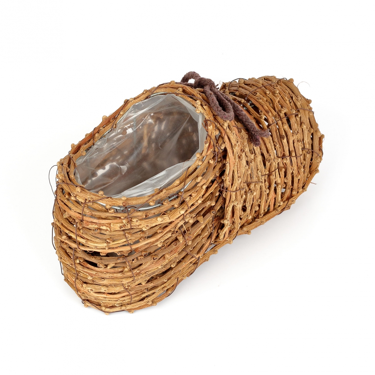 Kvetináč bota z nelúpaného prutia 29x13x15cm je skutočne originálny a zasluží si tak výjmočné miesto. Bota je vyrobená z prutia a súčasťou je plastová vložka, takže môžete zalievat kvety bez obáv.