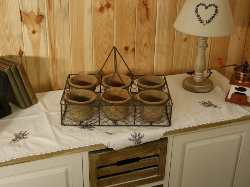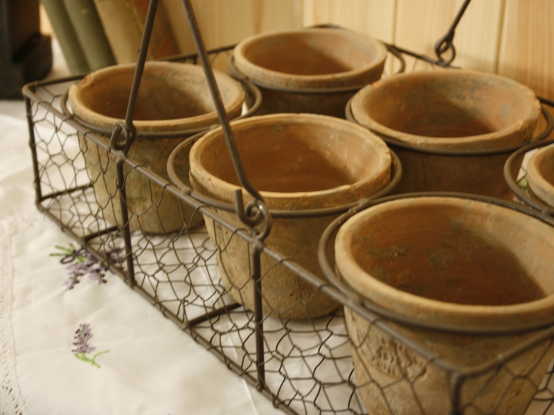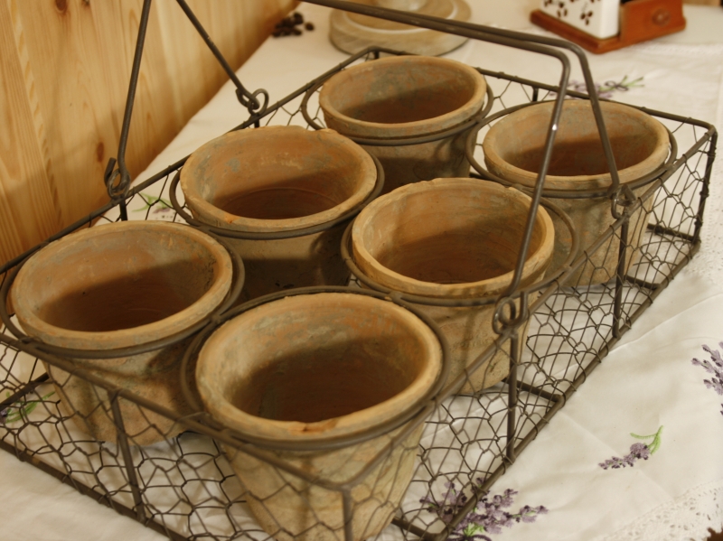Zdatní pestovatelia môžu jasať , pretože v tomto drôtenom koši umiestni a ľahko prenesú z miesta na miesto hneď šesť na vlas si podobných terakotových kvetináčov . Kôš je vyrobený z králičieho pletiva .