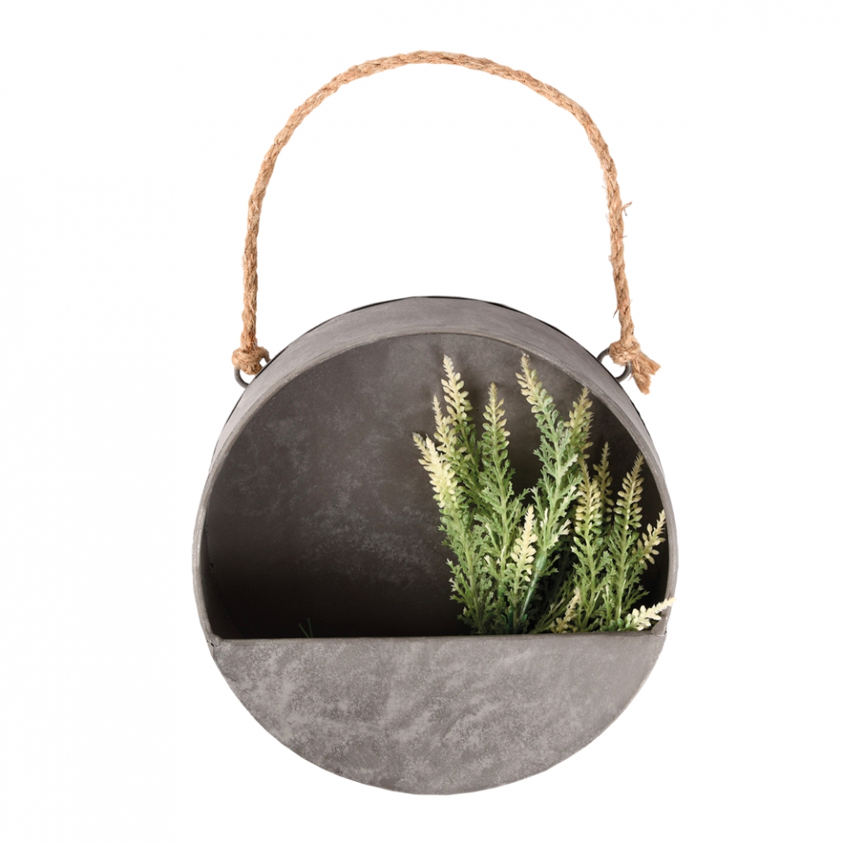 Je vyrobený zo zinku, takže si bez problémov poradí aj s vplyvmi počasia. K jeho zavesenie slúži jutový povrázok, ktorý svojou štruktúrou a farbou, ideálne dopĺňa hladký sivý kvetináč.