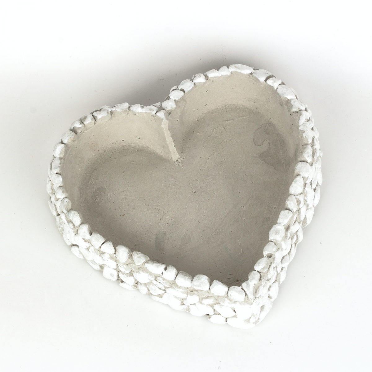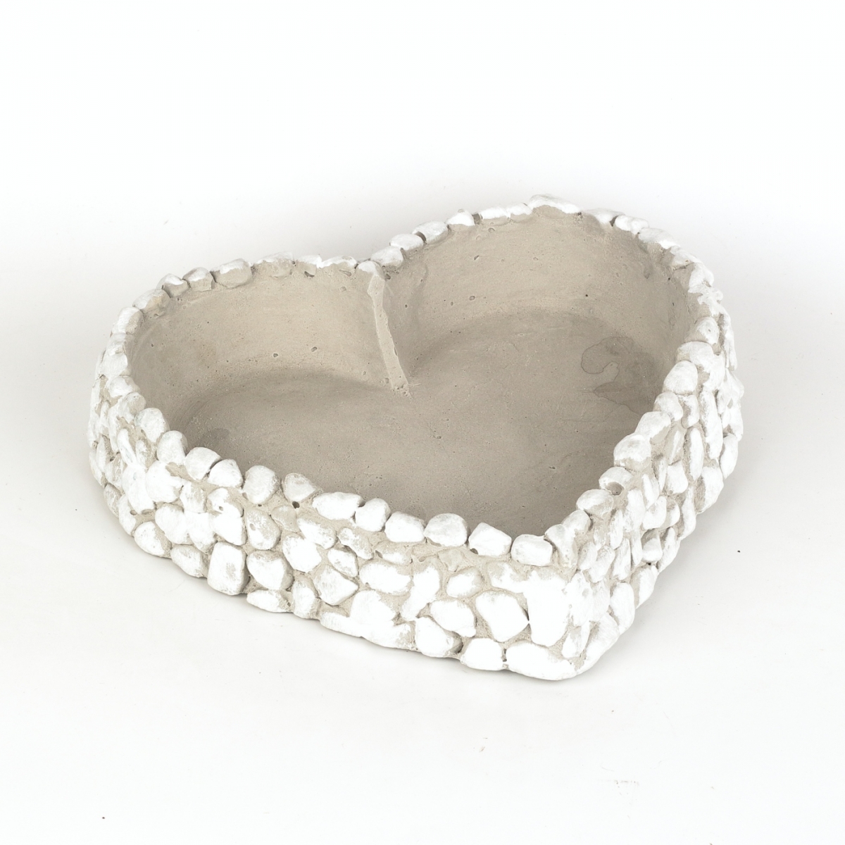 Kvetináč v tvare srdca, ktorého vonkajšia strana je zdobená mozaikou z kamienkov, je vyrobený z betónu, a preto je vhodný aj na vonkajšie použitie. Jeho rustikálny vzhľad vynikne na terase aj záhrade, ladených do romantického štýlu.