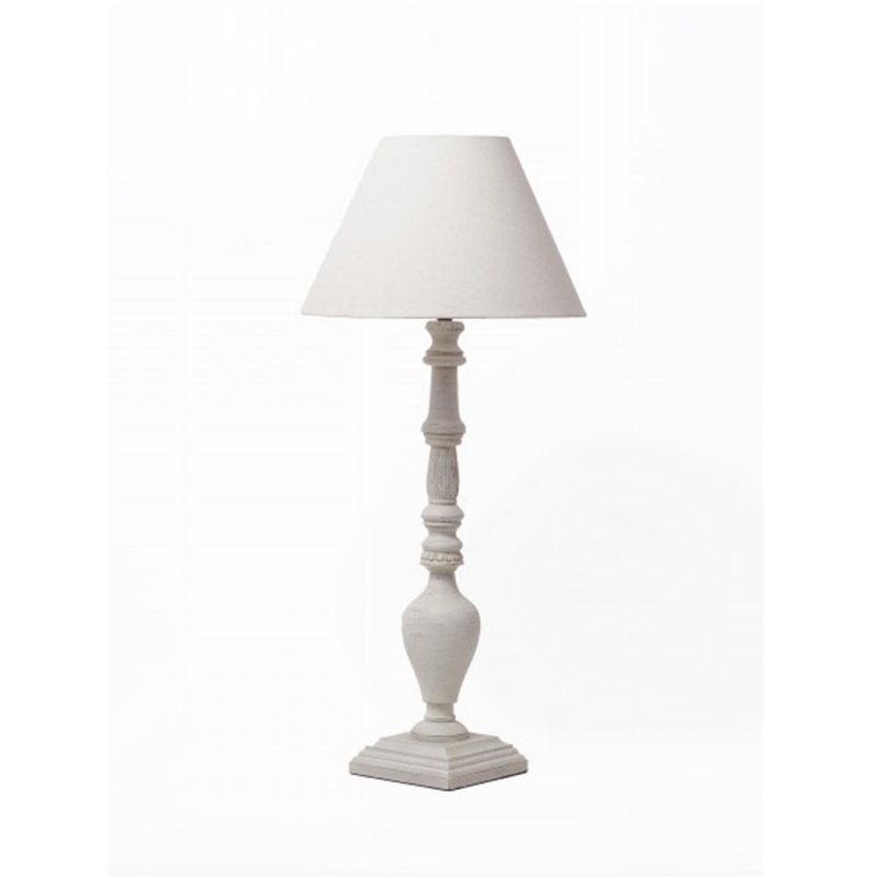 Lampa má krásnu sústruženie nohu v bielej farbe s patinou a jednoduchý hladký cylinder (tienidlo biely Sirma). Rovnaká lampa je v ponuke tiež s tienidlom béžový Sirma.