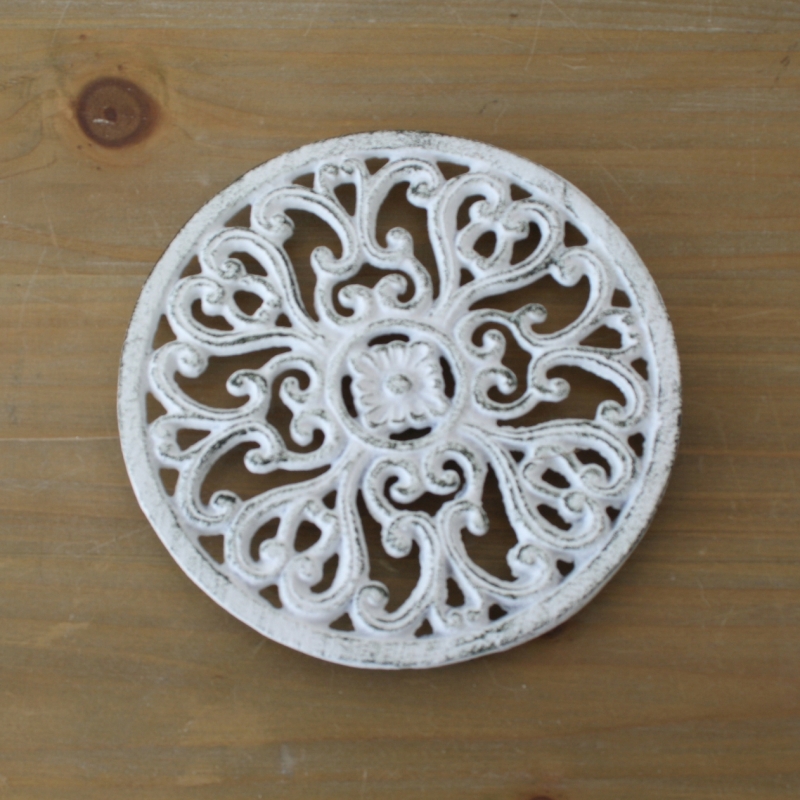 Táto podložka pod hrniec má okrúhly tvar a je bohato zdobená ornamentmi. Liatina má výraznú bielu patinu.