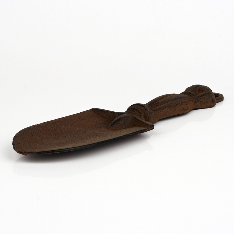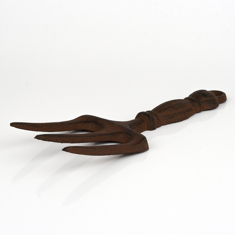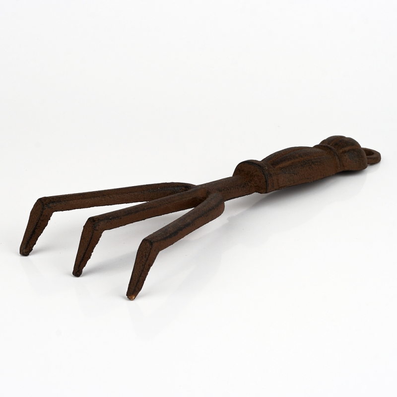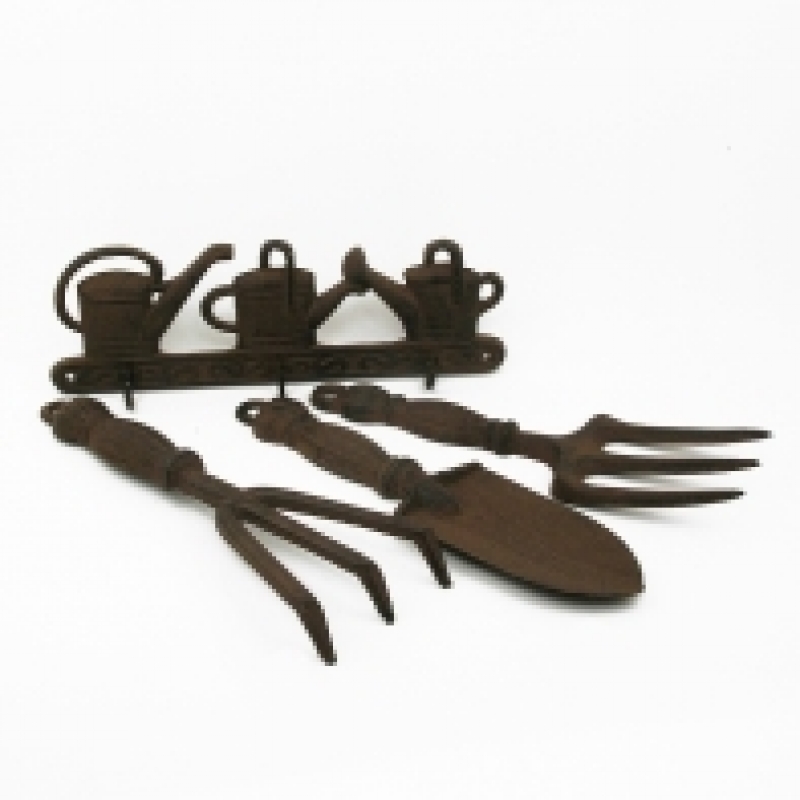 Litinová retro sada nářadí 29x38cm. Sada obsahuje závěsný věšák na zeď a tři pracovní nástroje. Lopatku, hrábě a vidle. Pracovní nástroje mají délku 29cm. Materiál litina.