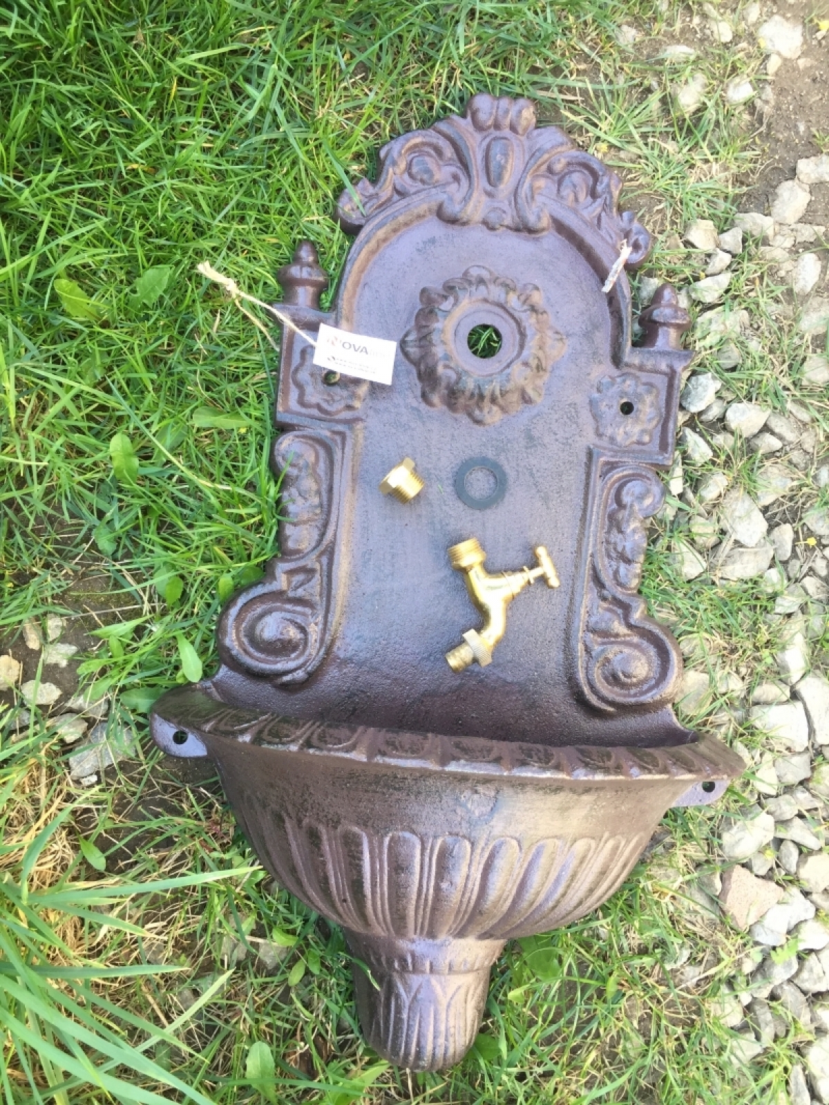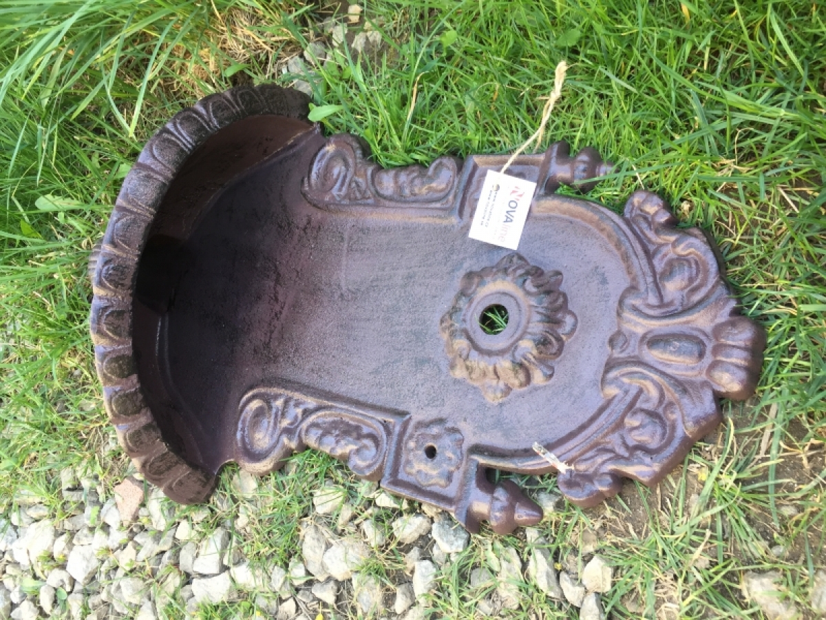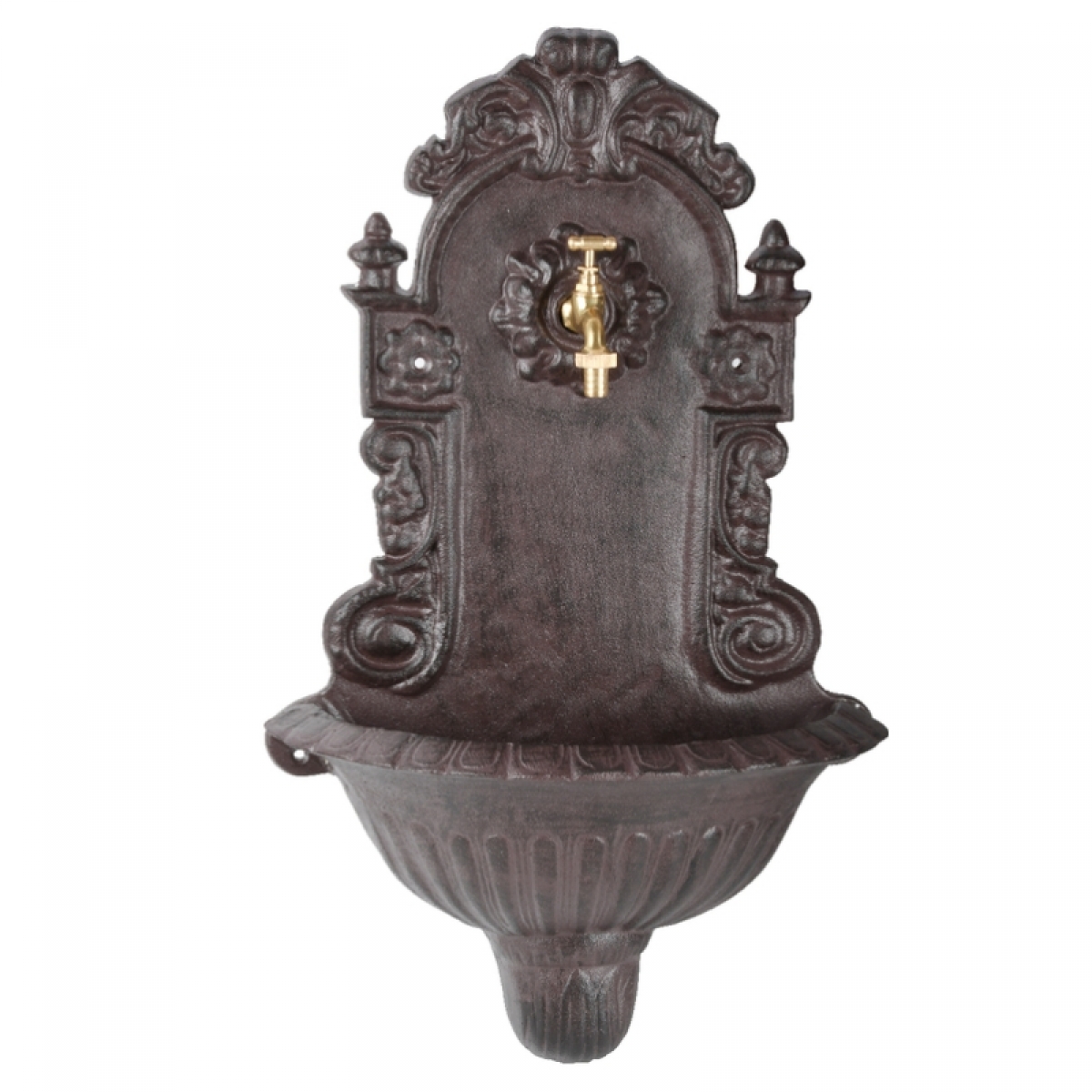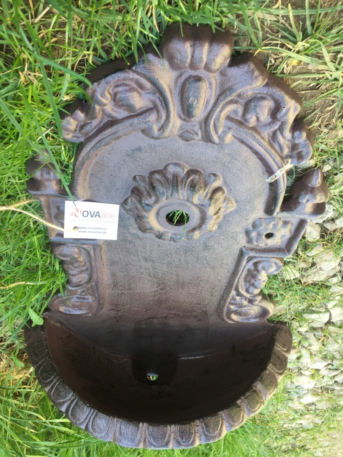 Záhradné litinové umyvadlo dodávame vrátane 1/2'' záhradného kohútika. Povrch zafarbený je základnou farbou v hnedom odstínu, s čiernou patinou.