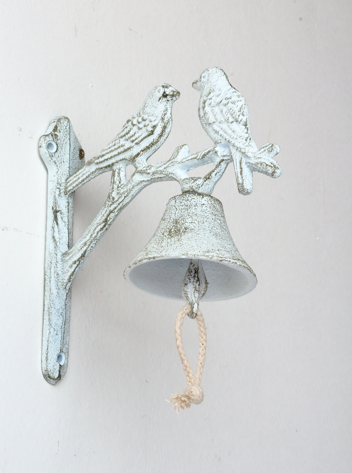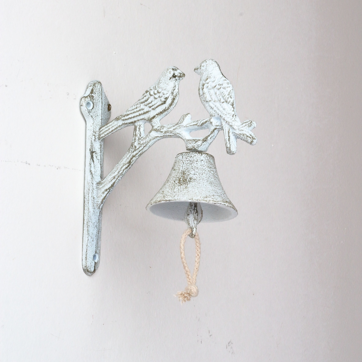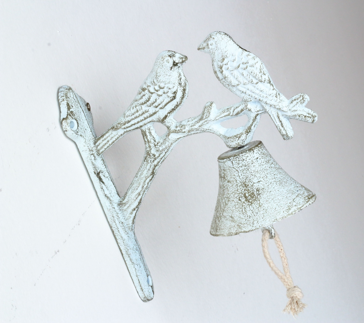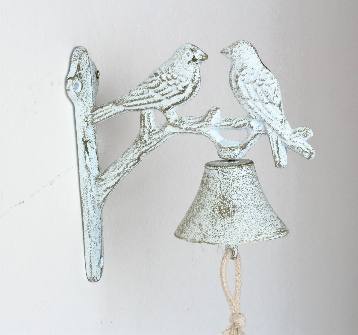 Liatinový nástenný zvonček s vtáčikmi biely rozoznie Váš domov ľúbivým zvukom.