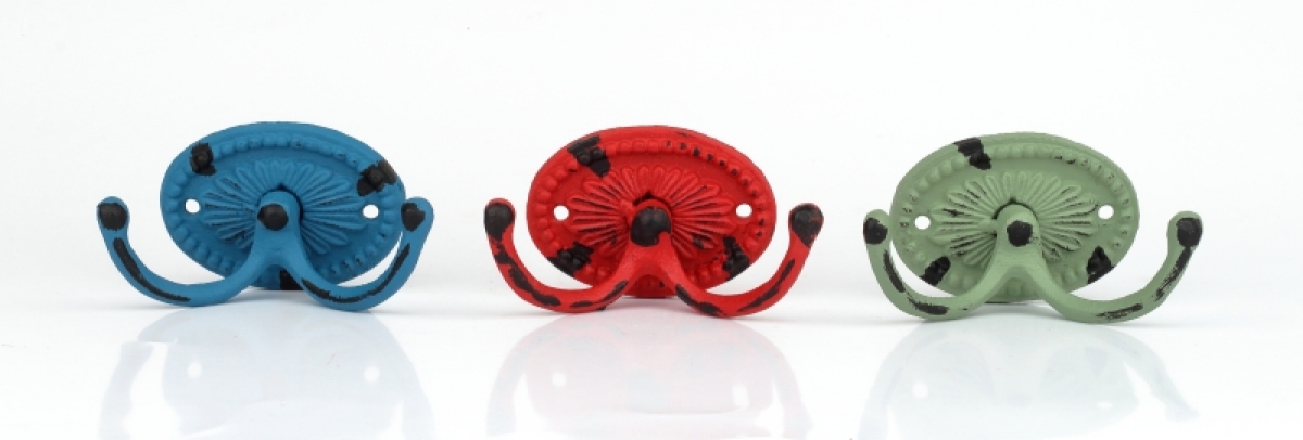 Liatinové háčiky sú dostupné v troch farbách. Kolekcia retro liatiny ponúka v rovnakom dizajne niekoľko typov háčikov, vešiakov aj šikovné zarážky na dvere. Vstup do domu tak môžete vyladiť do posledného detailu!