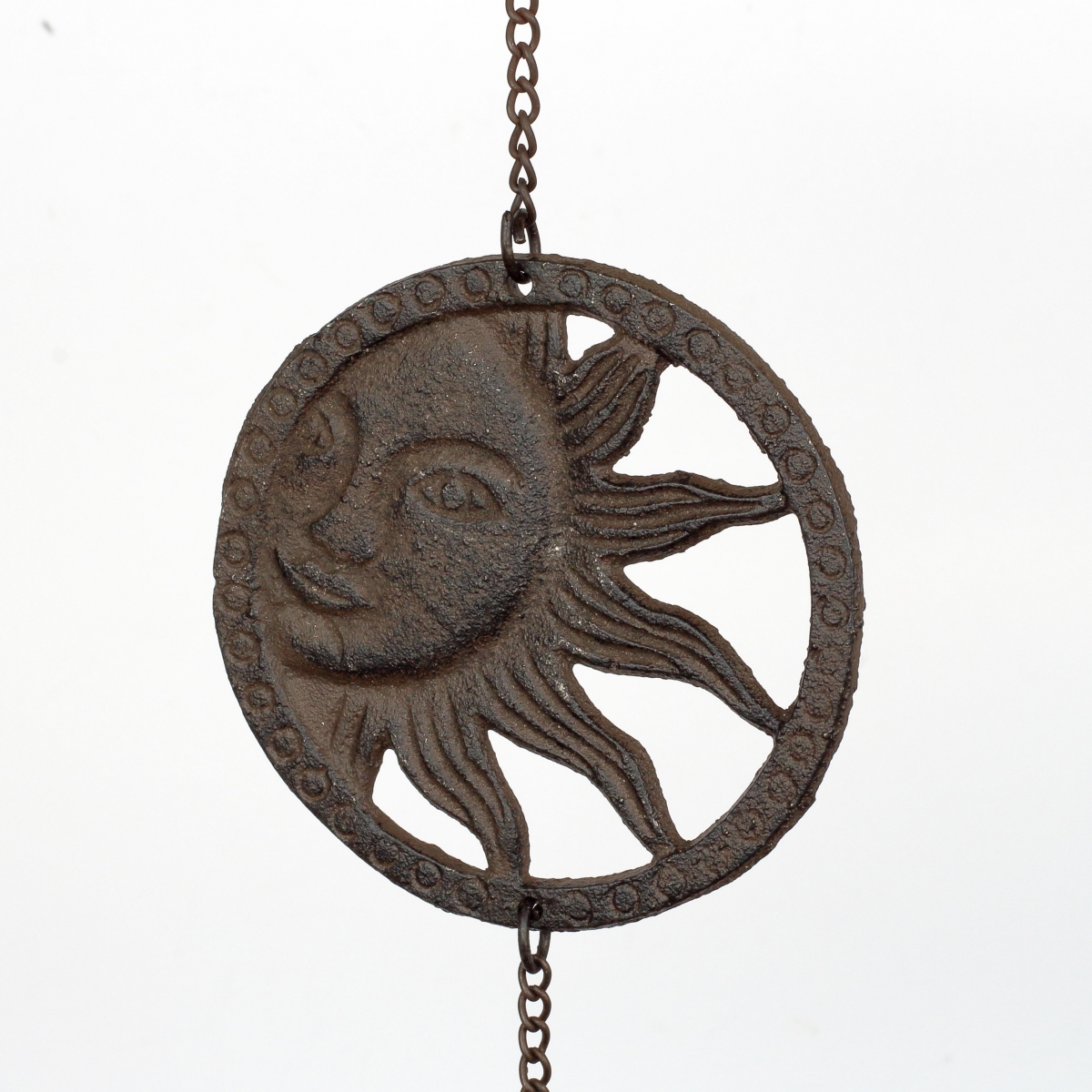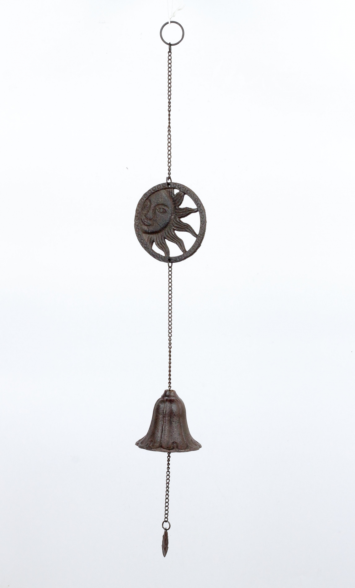 Liatinový závesný zvonček slnka v kruhu / zvonkohra 60cm rozezvoní prichádzajúce návšteva, alebo ľahký vánok. Zvuk liatinového zvončeka Vás bude baviť, a tak doprajte sebe aj svojej záhrade peknú závesnú dekoráciu!
