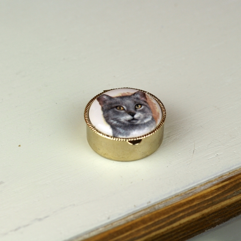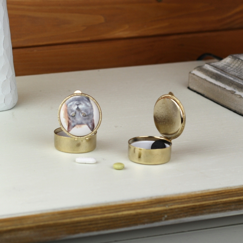 Fľaštička je z kovu a vo vnútri má plastovú misku, ktorú možno ľahko vybrať. Viečko krabičky je ozdobené krásnou šedou mačkou.