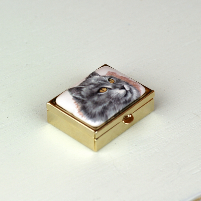 Krabička je z kovu a na viečku má motív maznavé šedej mačky. Poteší tak najmä milovníkov mačiek.