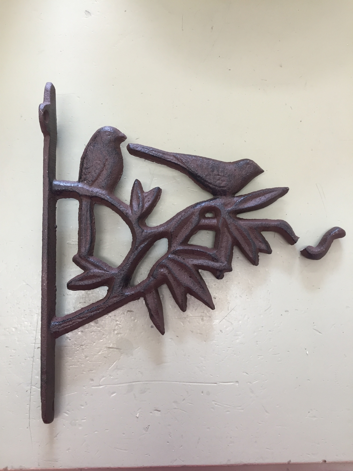 Záves konzoly liatinovej s vtáčikmi 20x23x5cm je vyradený z dôvodu odlomenia časti pre uchytenie kvetináča. Šikovný domáci kutil môže odlomený kúsok privariť späť a konzolka tak môže opäť slúžiť na zavesenie ľahšej dekorácie napr. zvonka, zväzku sušených kvetov.