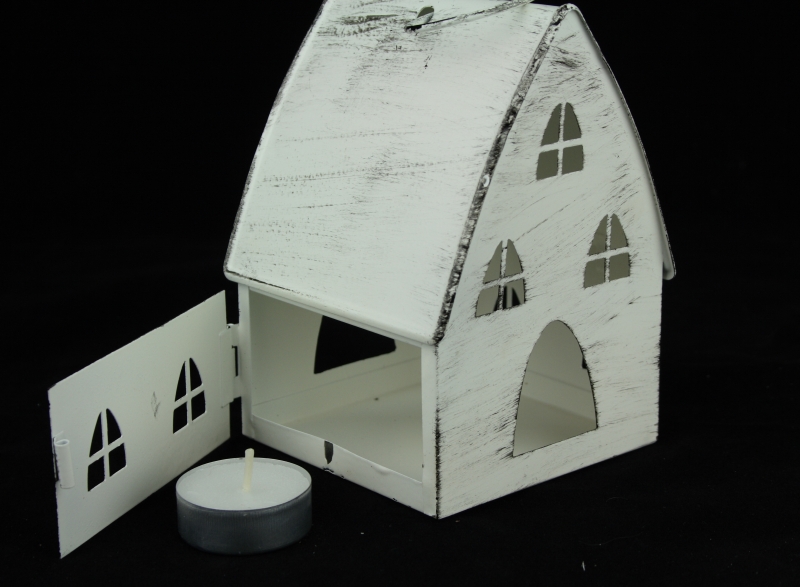 Má otvor na čajovú sviečku - zo strany domčeka sú malé dvierka, ktorými sviečku jednoducho vložíte. Je možné lampu položiť na komodu či policu, ale tiež zavesiť za kovový úchyt.