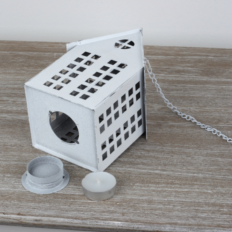Domček má všetky štyri steny pevne spojené. Čajová sviečka sa do neho vkladá otvorom v podeste. Lucernu môžete navyše zavesiť za retiazka s háčikom.