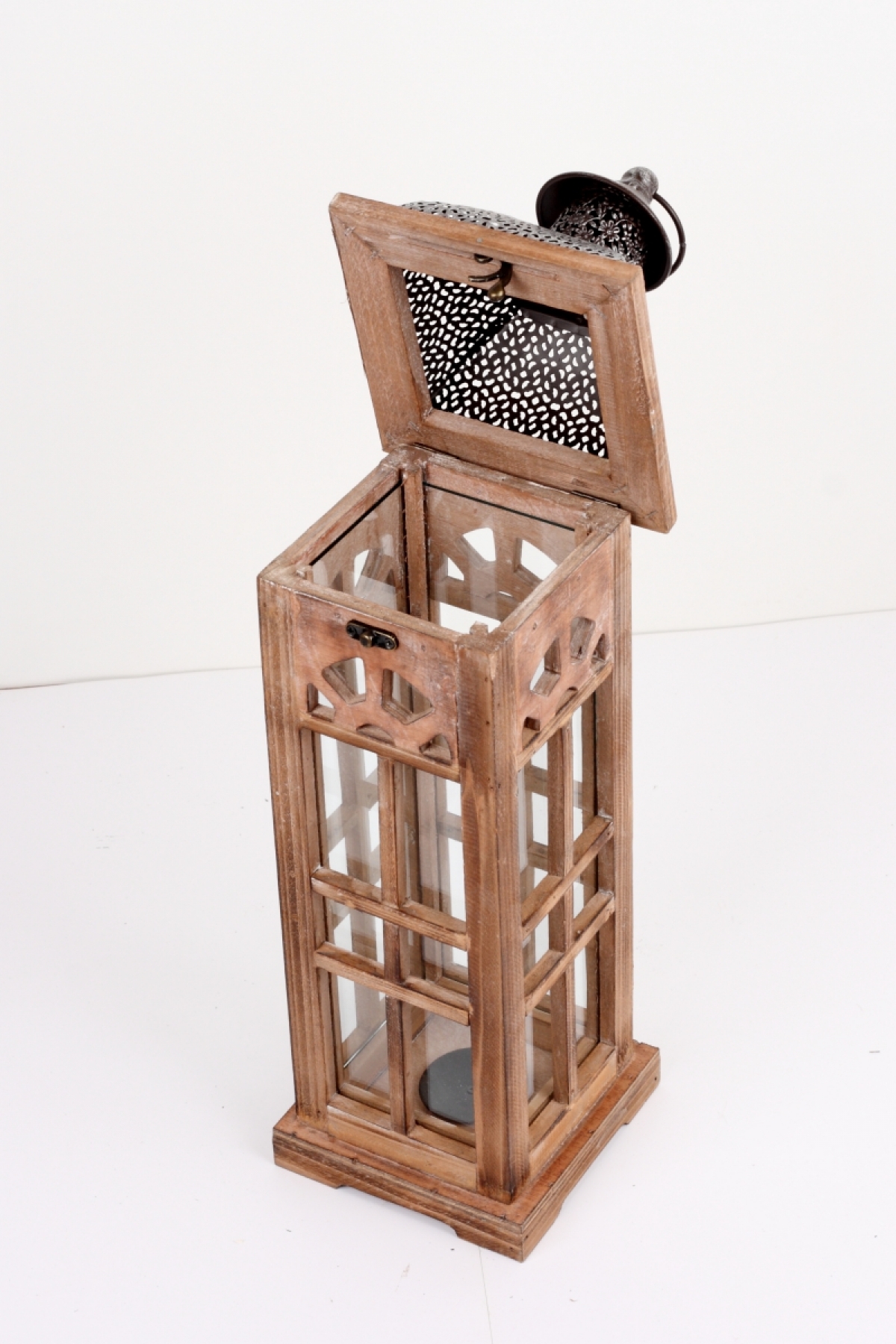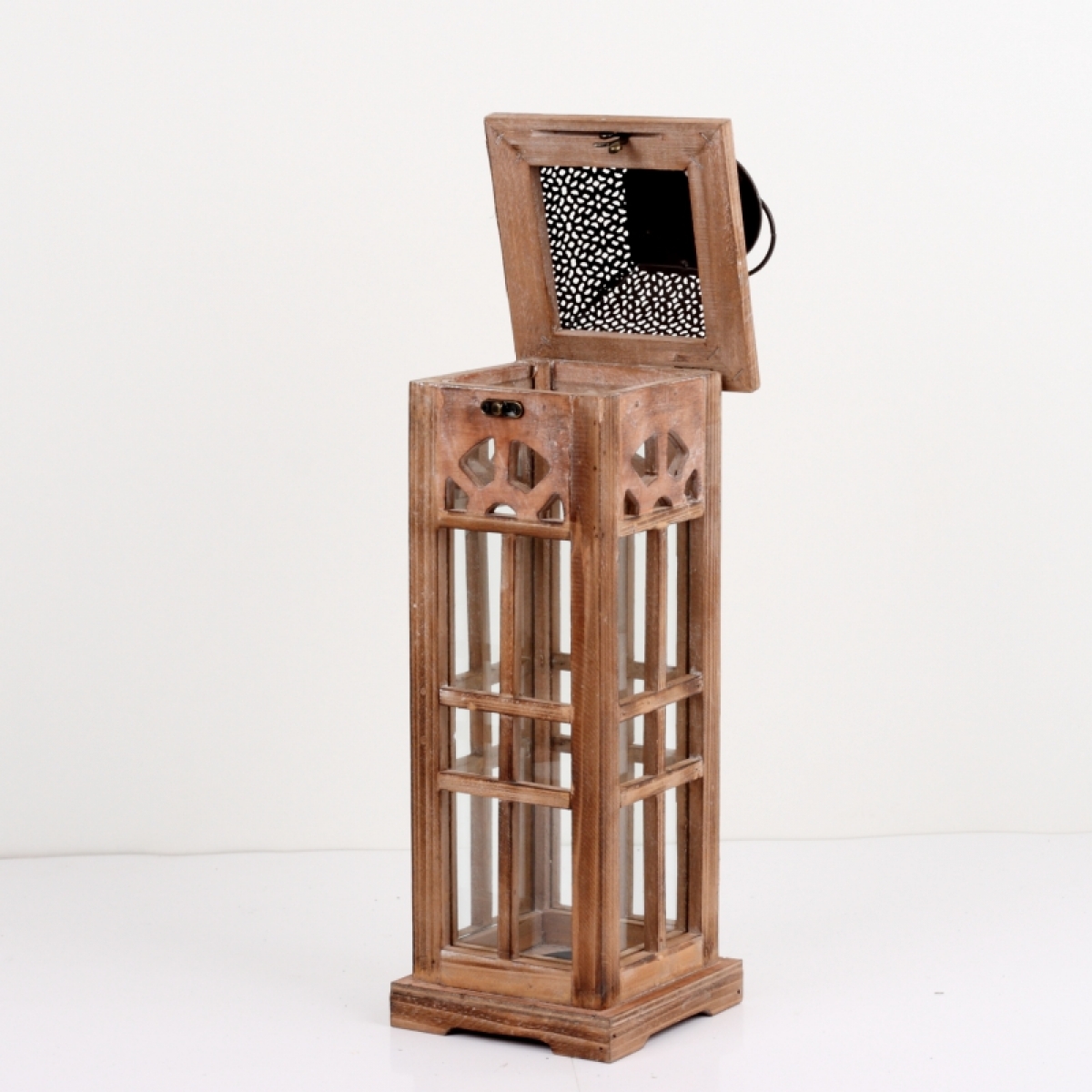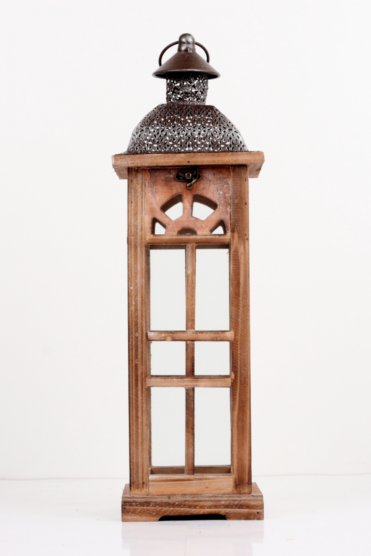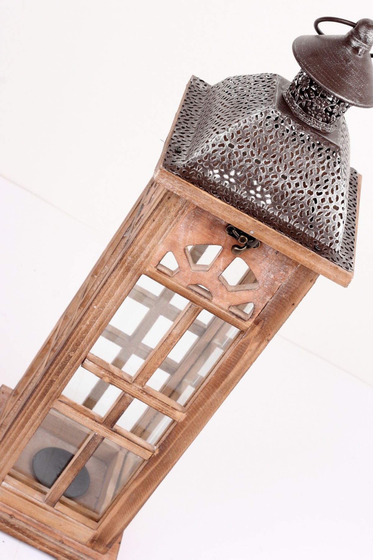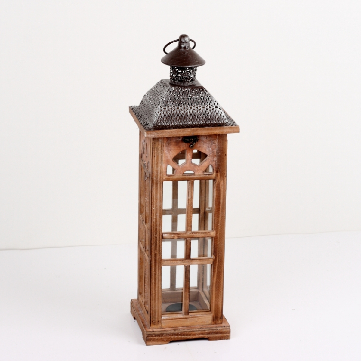 Lucerna drevená hnedá s kovovou strieškou strednou