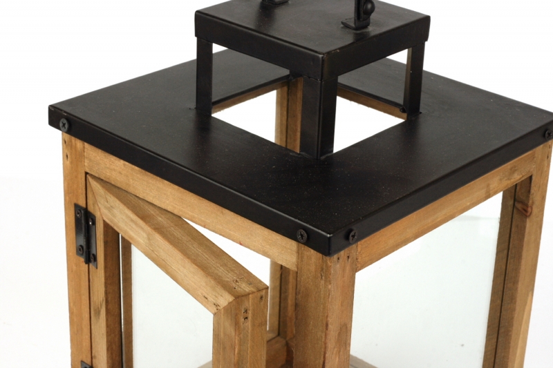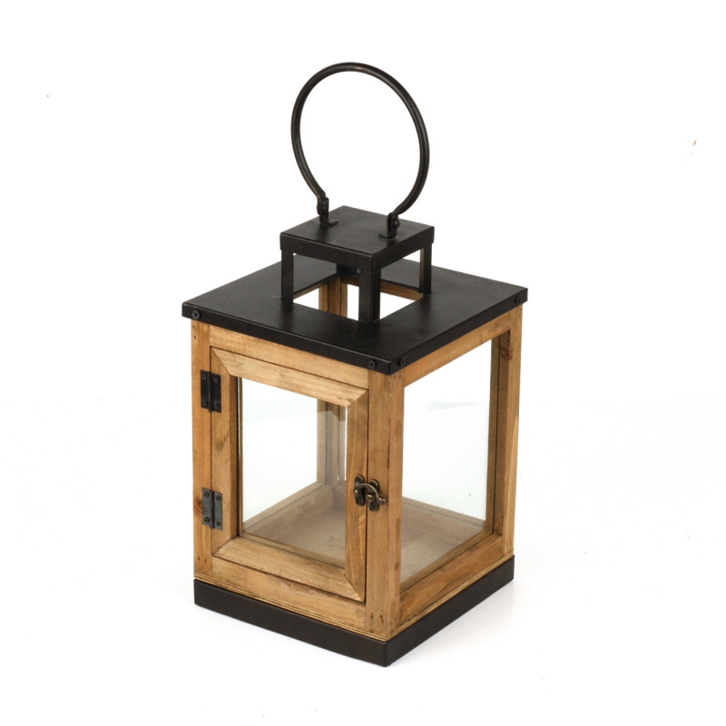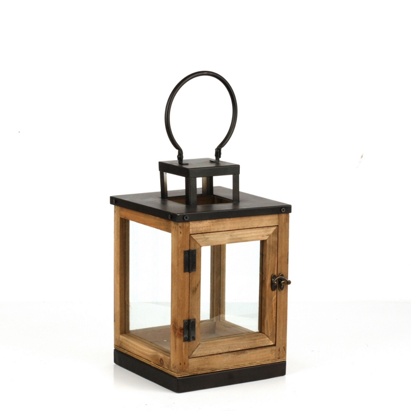 Drevená lucerna má presklené boky, kovové doplnky a veľké ucho na prenášanie. Predná strana lucerny slúži ako dvierka na západku.