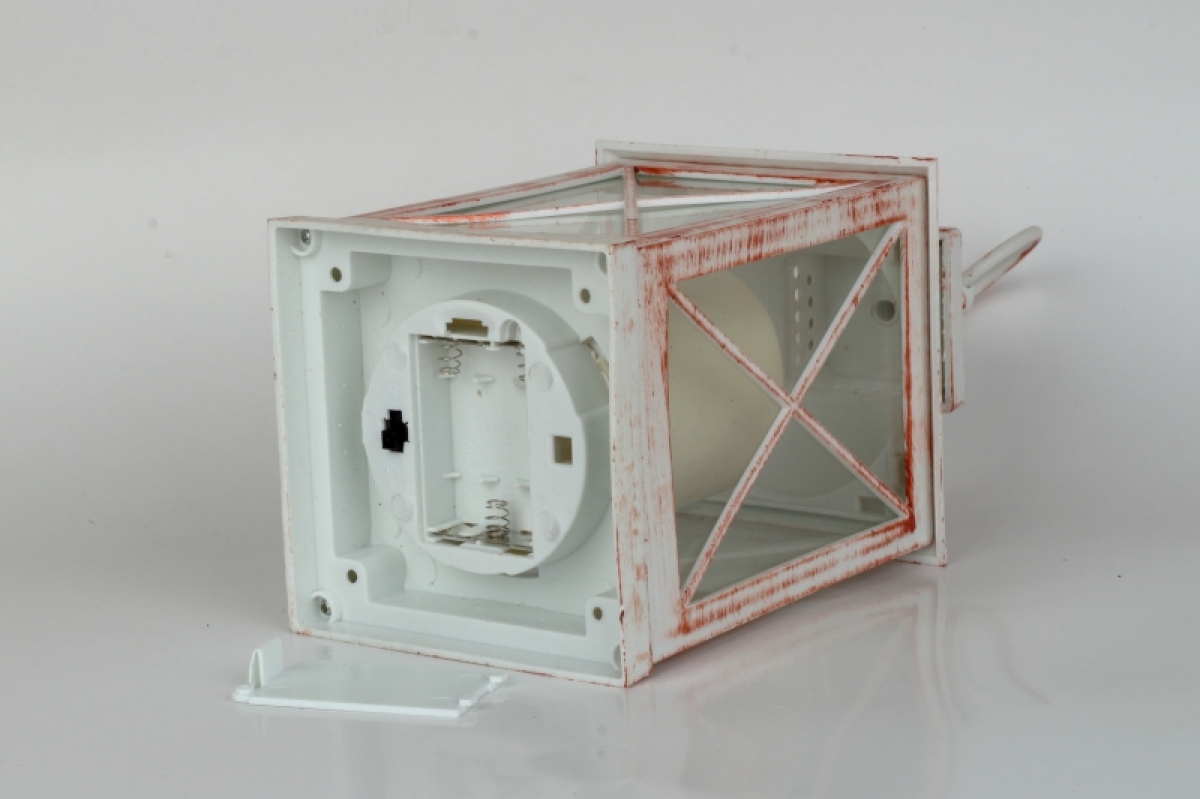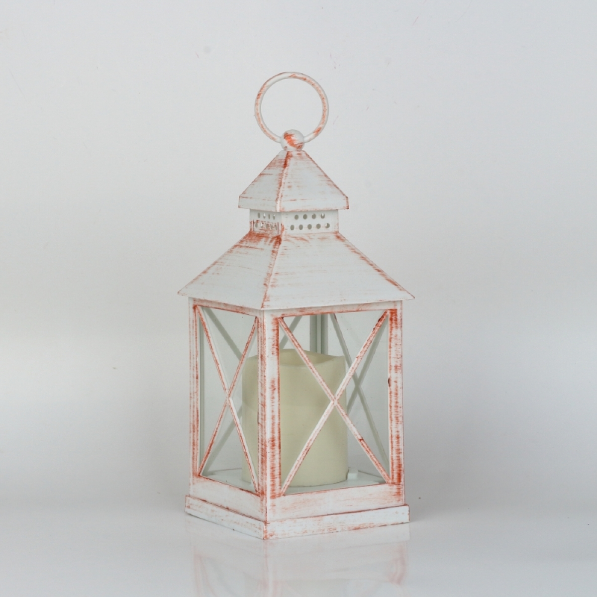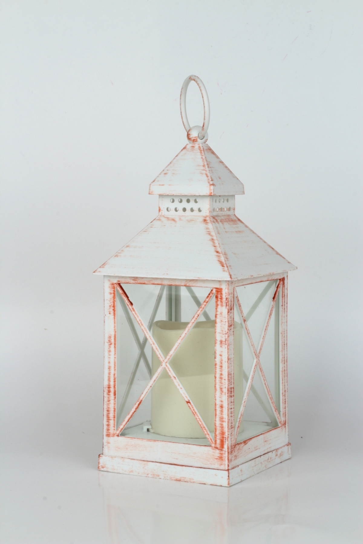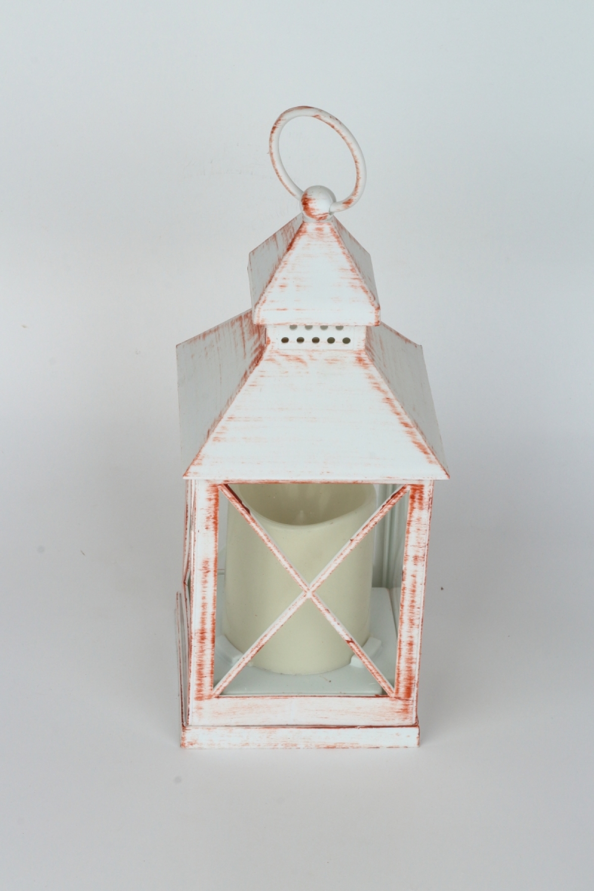 Dokonalá imitácia plechové lucerny s horiace sviečkou s priemerom 5,5 cm a výškou 7cm.