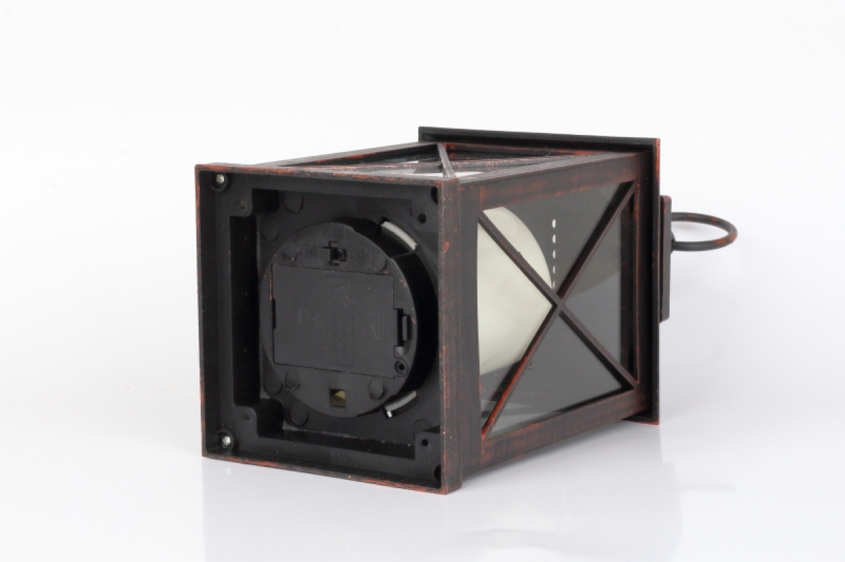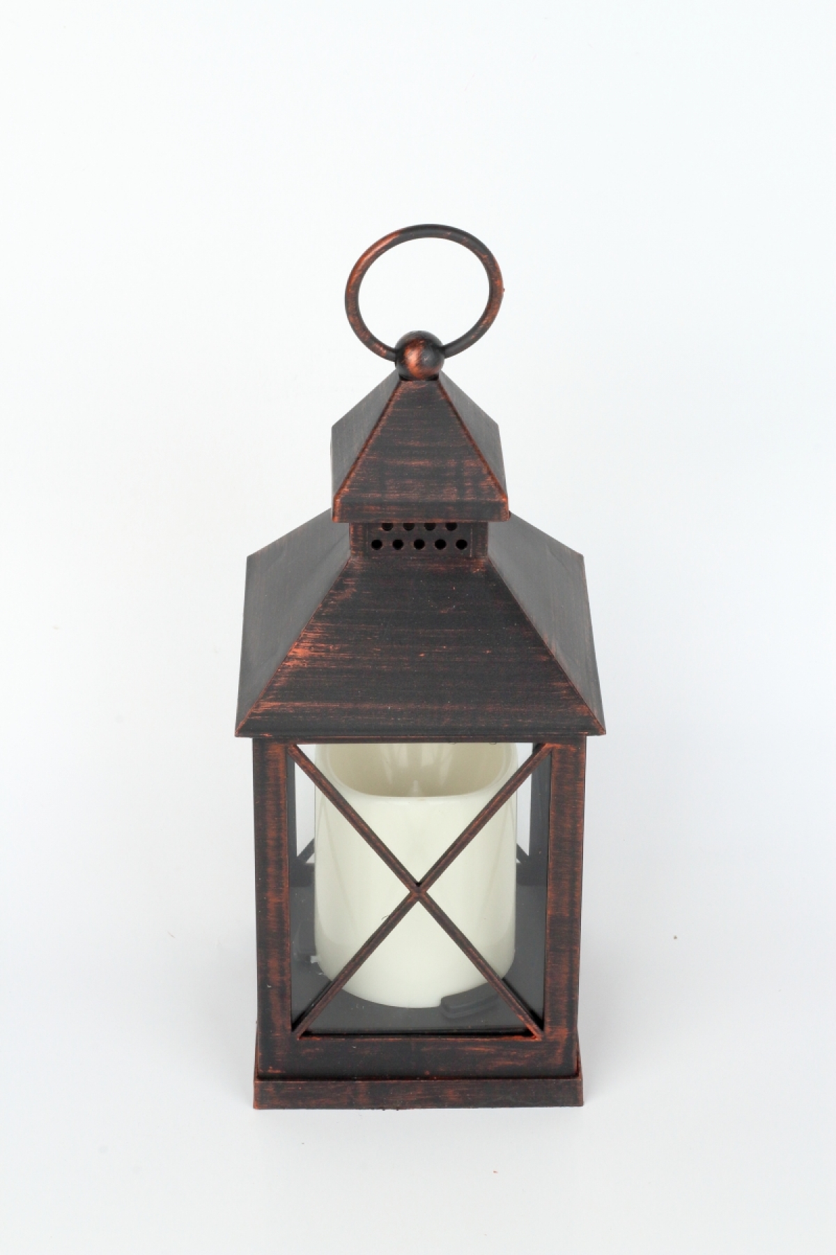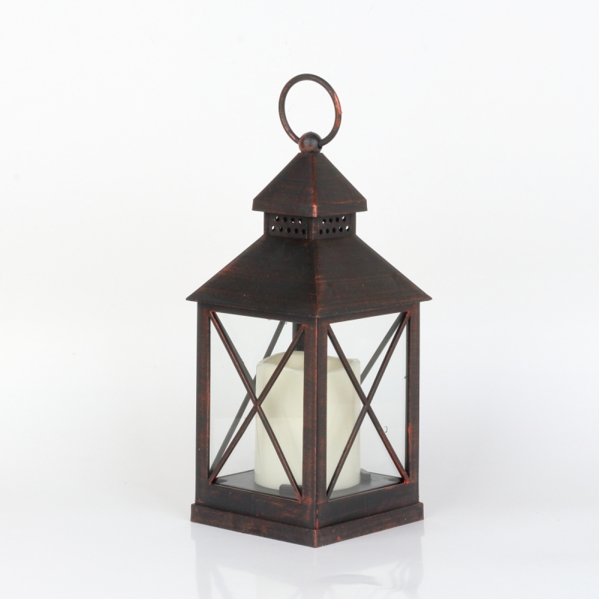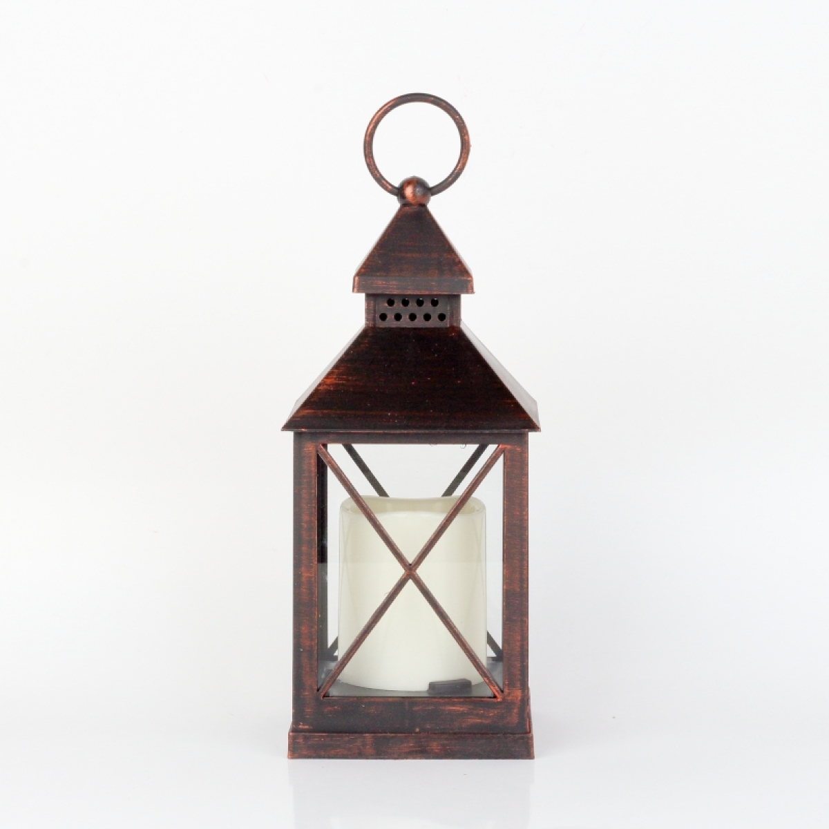 Dokonalá imitácia plechové lucerny s horiace sviečkou s priemerom 5,5 cm a výškou 7cm.