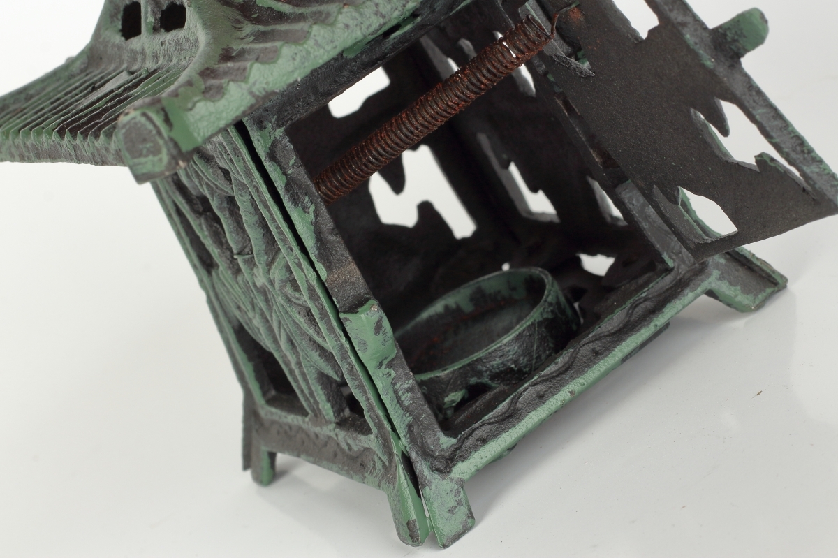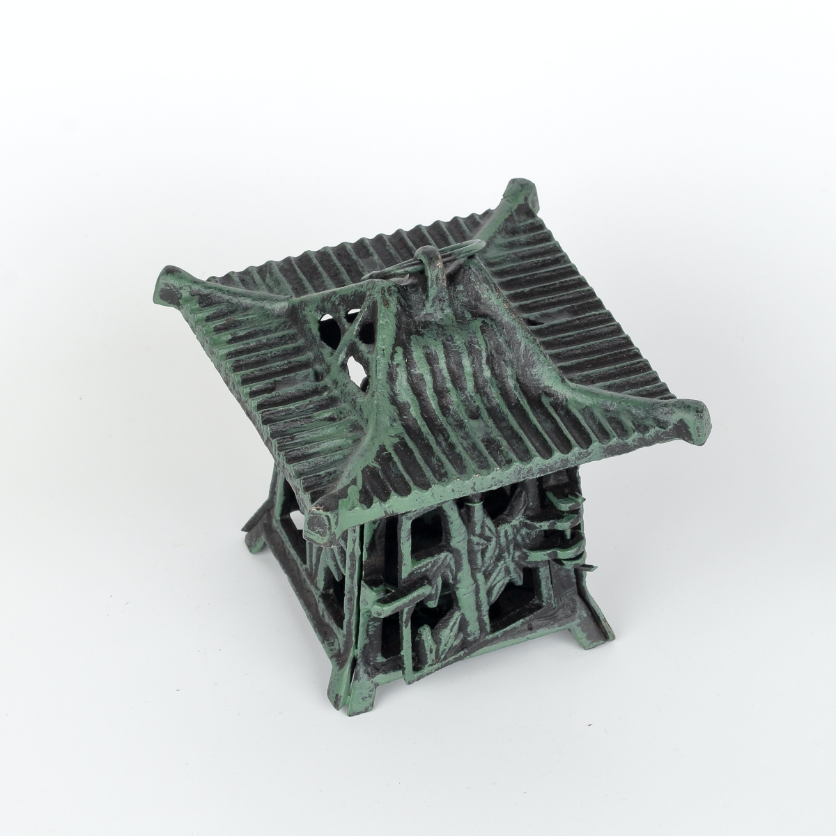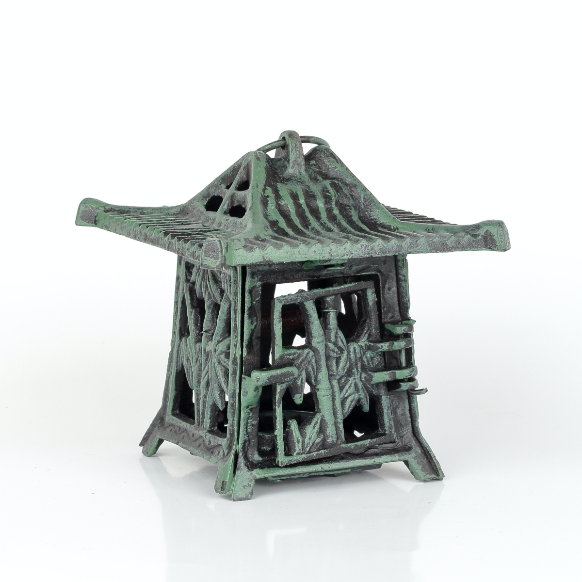 Lucerna na sviečku v podobe liatinovej pagody v nazelenalú odtieni