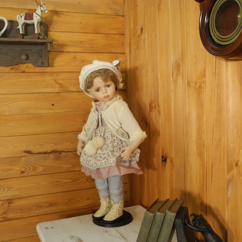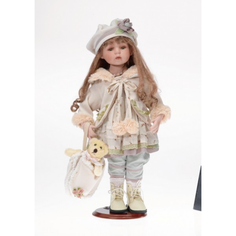 Luxusná porcelánová bábika Vanesa, ktorú vidíte na obrázku je vysoká 56 cm. Je sviatočne oblečená do šiat vo svetlých tónoch. Pýšiť sa môže dlhými vlnitými vláskami. Tie sú čiastočne zakryté nazdobené čiapkou. Bábika so sebou má aj svojho malého priateľa - plyšového medvedíka. Určite prinesie radosť každému, kto podobnú hračku dostane ako darček alebo si ju pre radosť zaobstarajú.